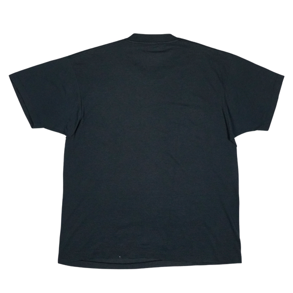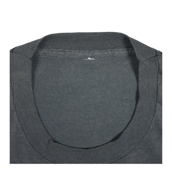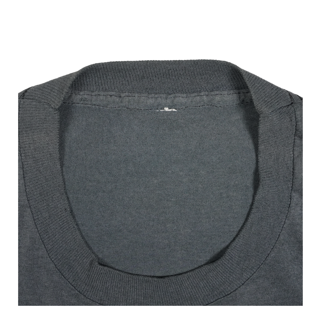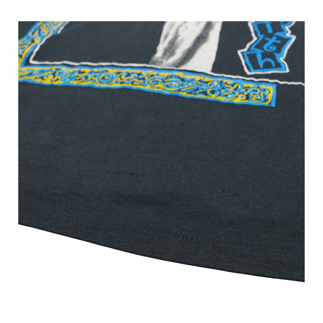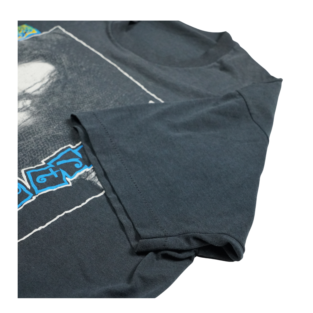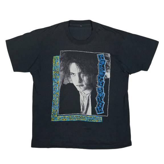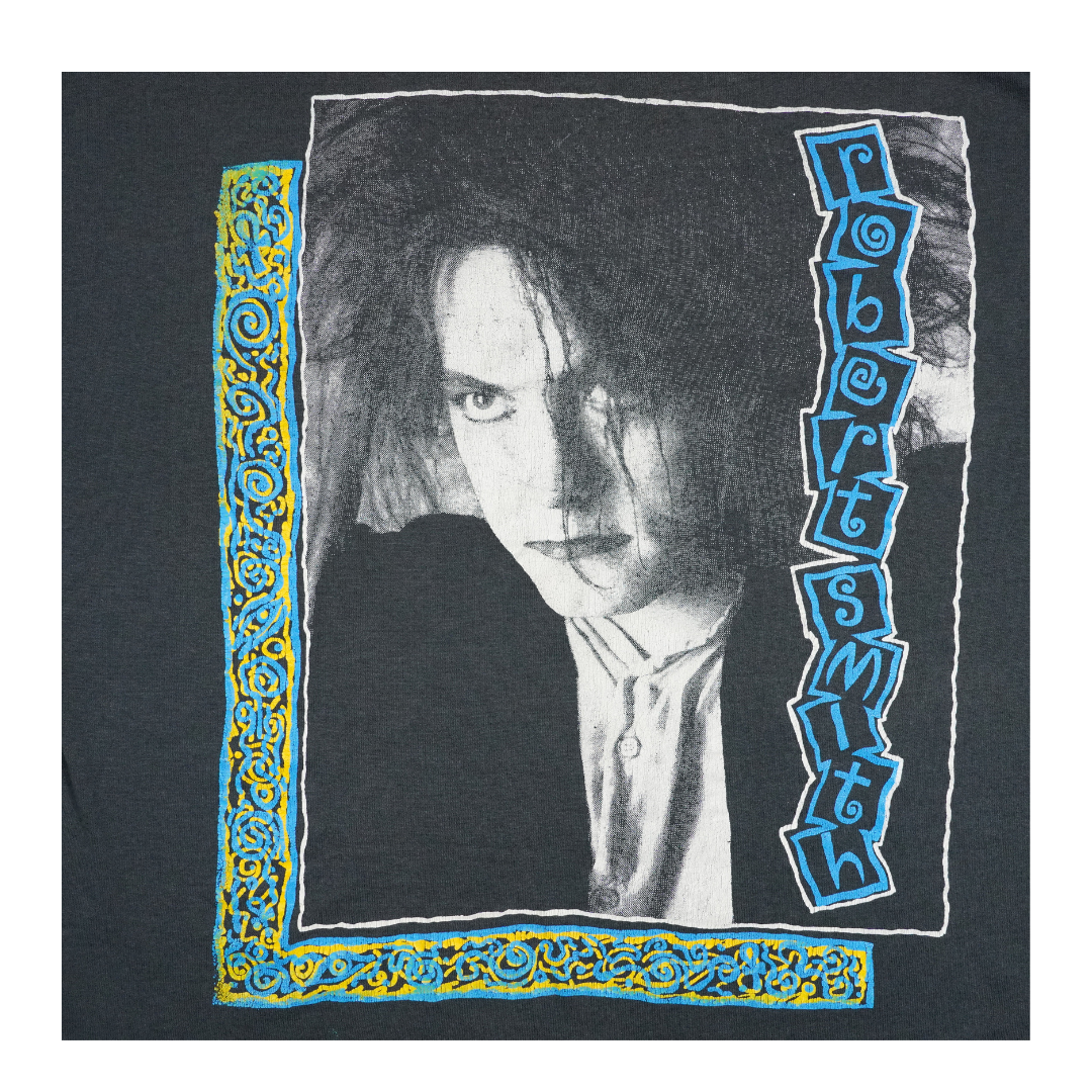 This vintage 1980s Robert Smith tee captures the haunting essence of The Cure’s iconic frontman at the peak of the band’s post-punk and gothic influence. Featuring a stark black-and-white portrait framed with vibrant blue and yellow patterned borders, the shirt embodies the band’s dramatic style and Robert’s unmistakable presence. The Cure were central to shaping the goth and alternative sound of the decade, and Robert Smith’s image became a symbol of that cultural moment. This tee is more than just a collectible—it’s a wearable piece of music history, connecting fans to the moody, atmospheric world that defined an era of alternative music.
