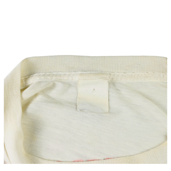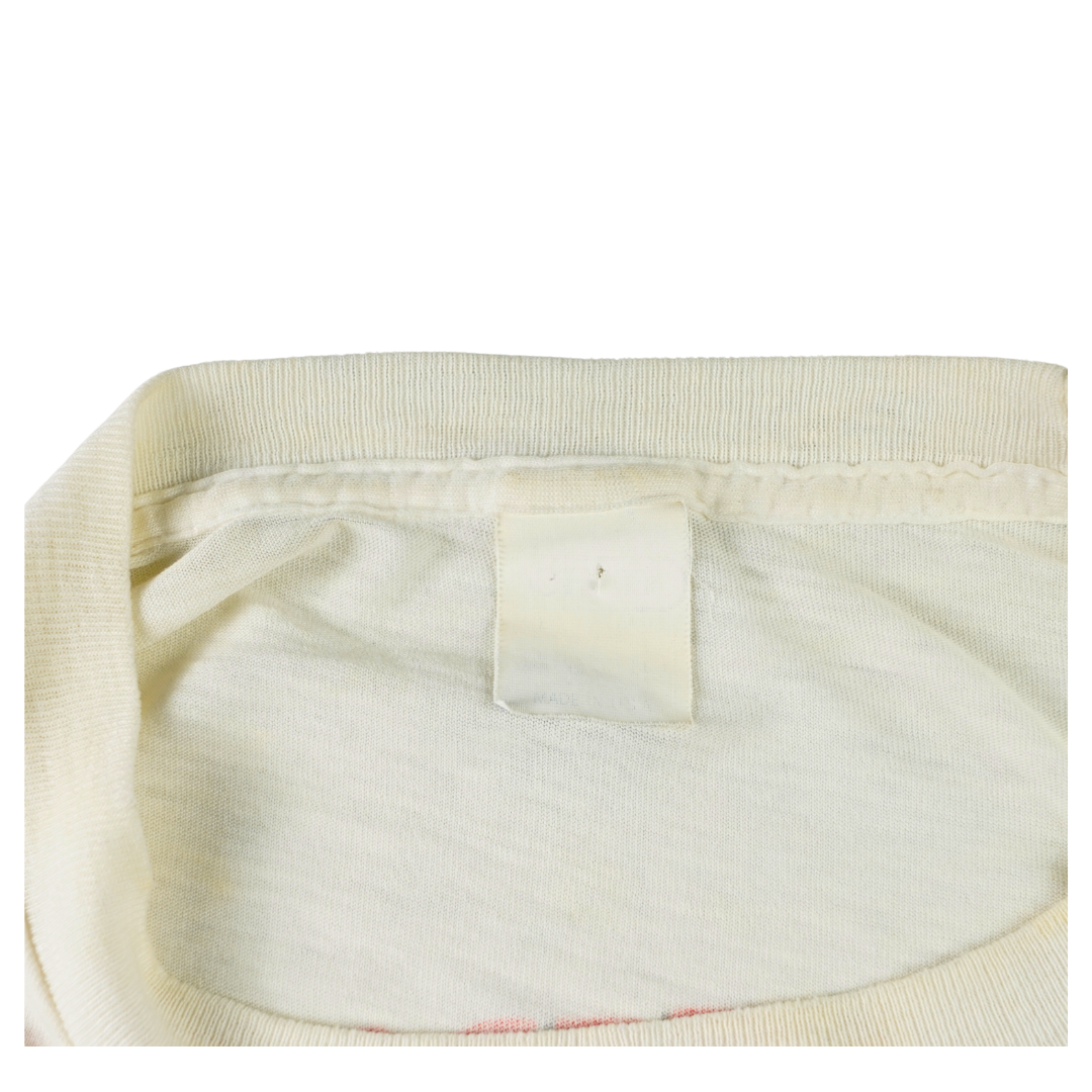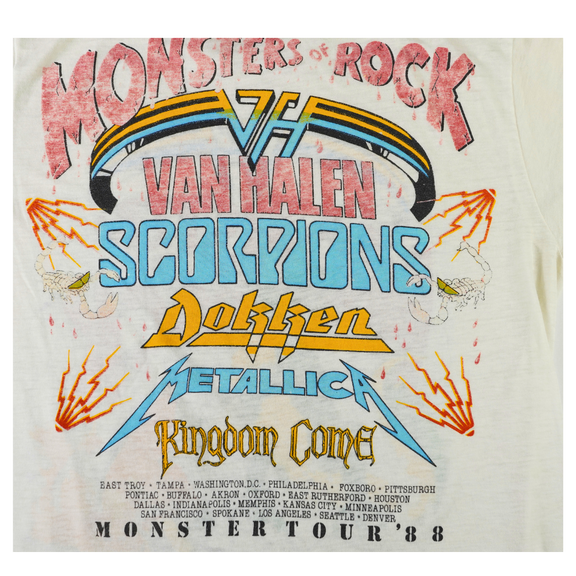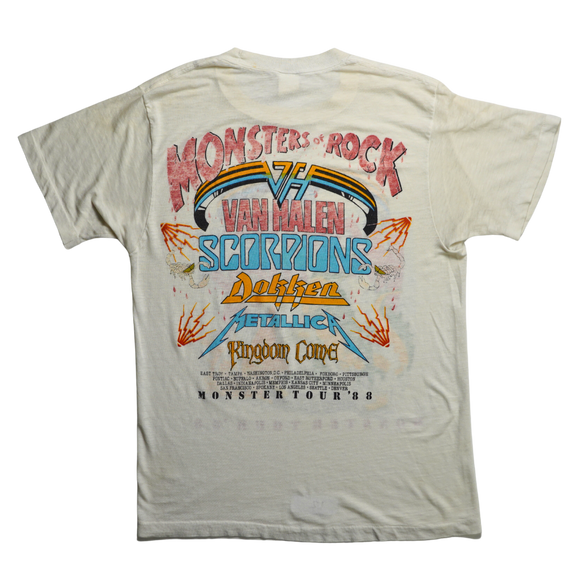 Original vintage 1988 Monsters of Rock tour tee featuring Van Halen headlining alongside Scorpions, Dokken, Metallica, and Kingdom Come. The front graphic unleashes a Godzilla-like reptile wielding a guitar amid stadium destruction, while the back showcases the full lineup and tour cities in electric typography. Printed on a soft single-stitch blank with a mostly faded tag and well-worn cotton consistent with age. A true artifact from one of the loudest lineups in rock history.
