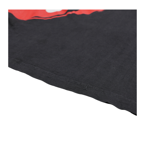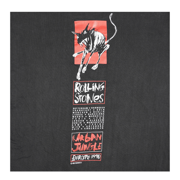 The back features a snarling black cat crouched against a red square, with Urban Jungle lettered in raw, graffiti-inspired strokes. Beneath it, a full tour stop list runs down the center, marking cities across Europe where Mick, Keith, Ronnie, and Charlie kept the flame of rock & roll burning into a new decade. Printed under Brockum license, the tee carries all the hallmarks of authentic Stones merch from the early ‘90s.