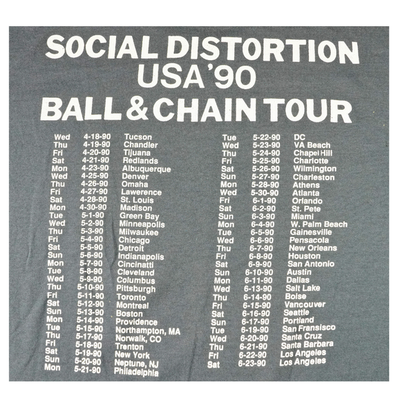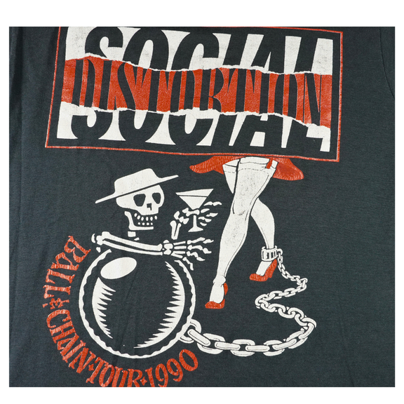 This 1990 Social Distortion tour tee is a punk time capsule from the Ball & Chain era. The front hits hard with the band's signature skeleton sipping a martini, chained to a red heel—iconography forever tied to their outlaw punk ethos. The back lists every stop on the USA '90 tour, from Tijuana to NYC to Santa Cruz.