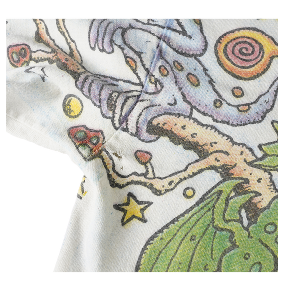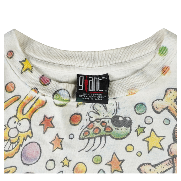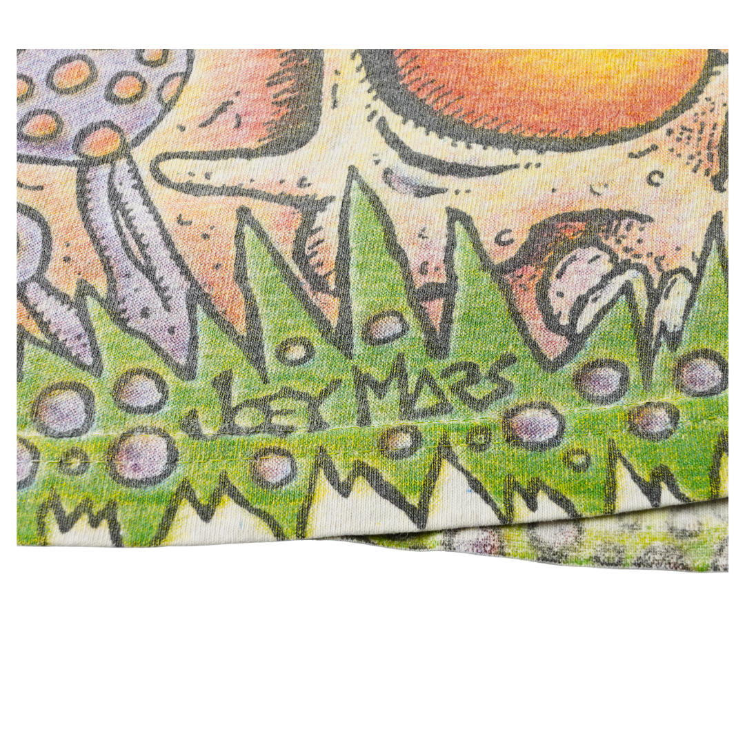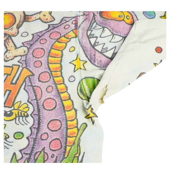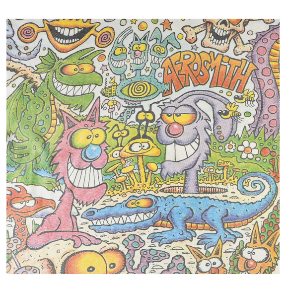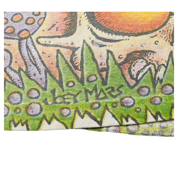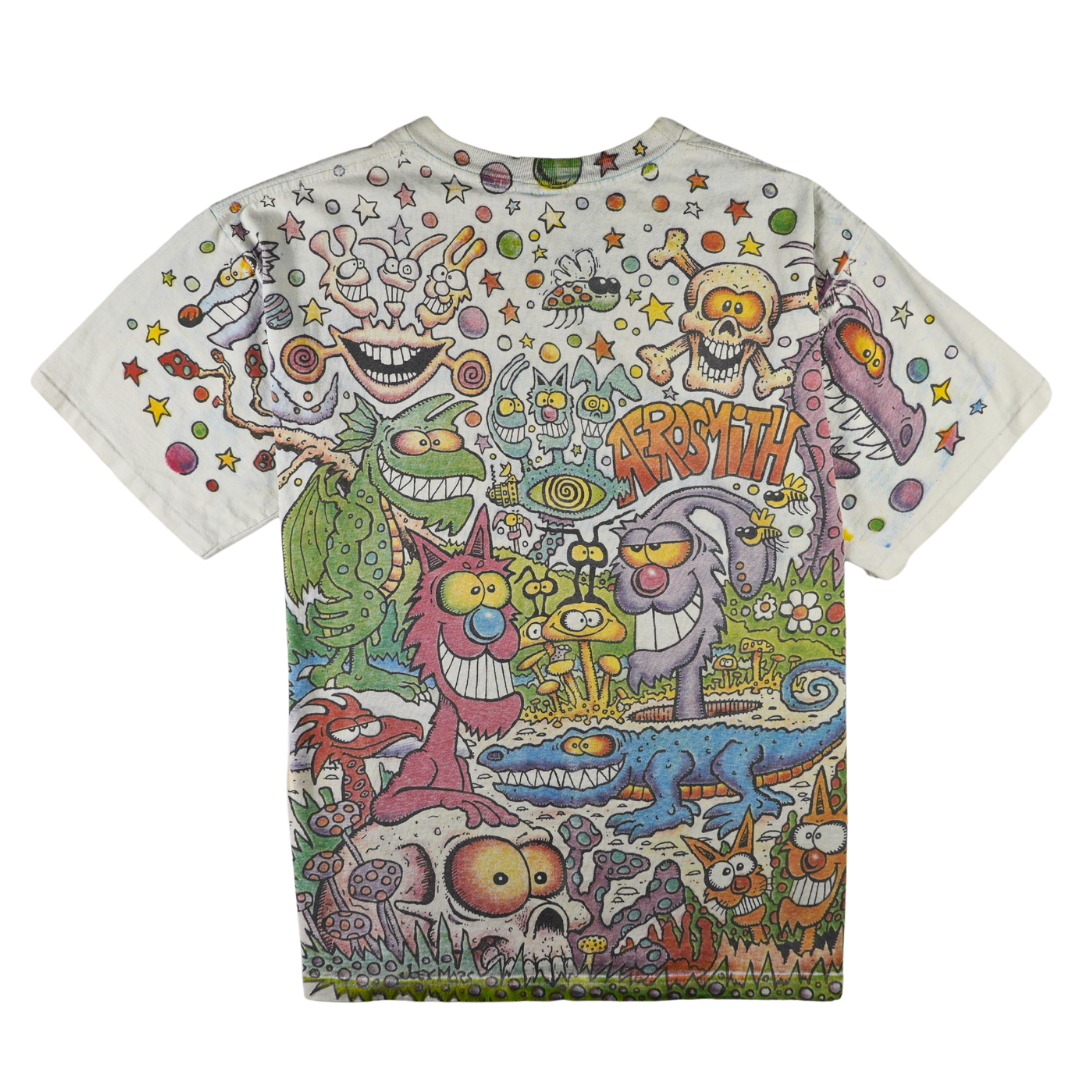 Step into the wild imagination of Joey Mars with this vintage 1990s Aerosmith all over print (AOP) tee. Designed on a heavyweight Giant tag and made in the USA, this XL shirt bursts with surrealist color, psychedelic characters, and chaotic ‘90s energy. Commissioned by Aerosmith during their experimental era, this rare AOP design captures the band’s trippy visual identity like no other. Perfect for collectors of authentic vintage band merch or fans of Mars’ iconic underground art.