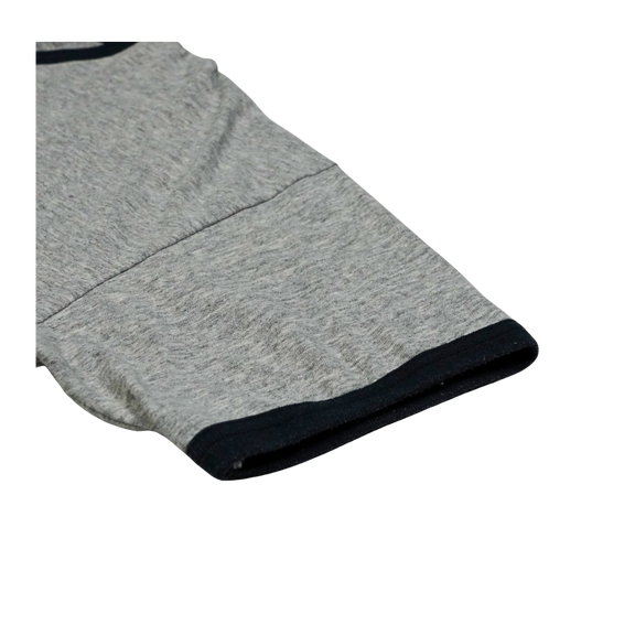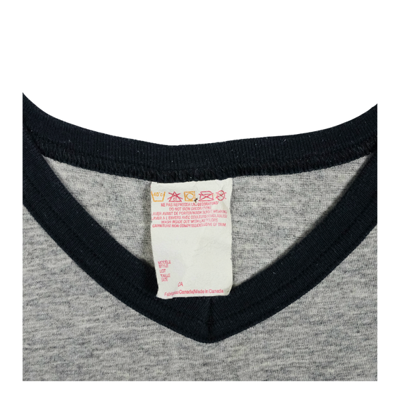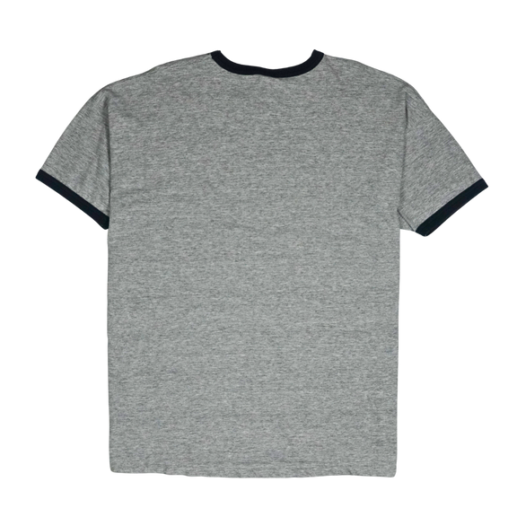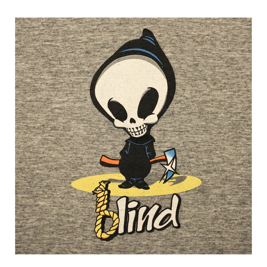 This vintage 1990s Blind Skateboards tee features the brand’s iconic Grim Reaper graphic, a defining image from the skateboarding boom of the decade. Set on a heather grey ringer body with navy trim, the playful skeleton design captures Blind’s rebellious yet cartoonish style that helped shape skate culture. A true vintage piece for collectors of 90s skate apparel.