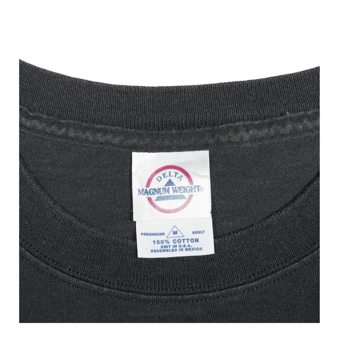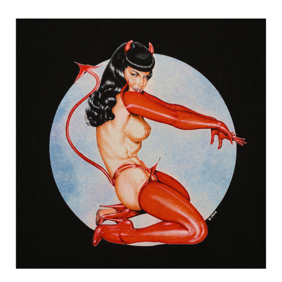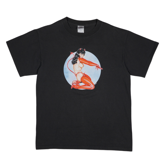 This vintage 1990s tee captures the iconic Bettie Page pin-up aesthetic with a devilish twist. The bold front graphic features a seductive devil girl in red boots, gloves, and horns, posed against a stark white circle backdrop. Printed on a Delta Magnum Weight tag, this shirt hails from an era when risqué pin-up art collided with counterculture fashion. The design embodies the 90s fascination with retro nostalgia and edgy underground style, making it a sought-after collectible among vintage tee enthusiasts. A perfect example of how Bettie-inspired imagery shaped pop culture and alternative fashion in the pre-2000s era, this shirt is both a statement piece and a nod to the enduring legacy of pin-up art.