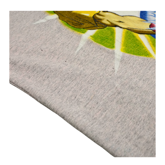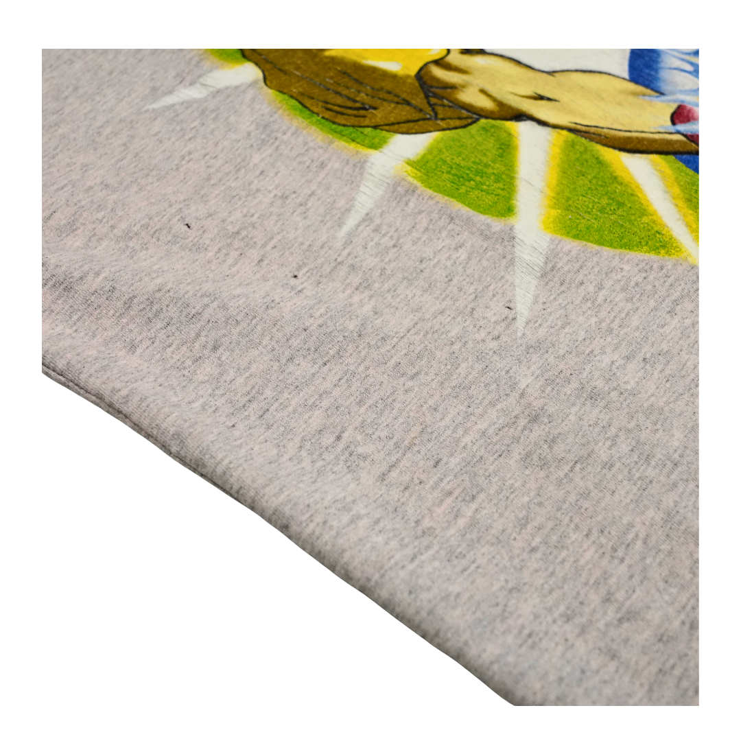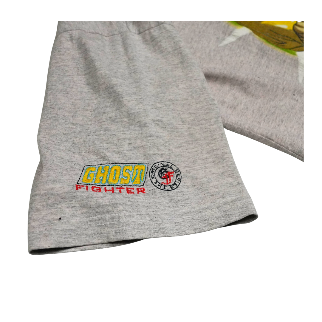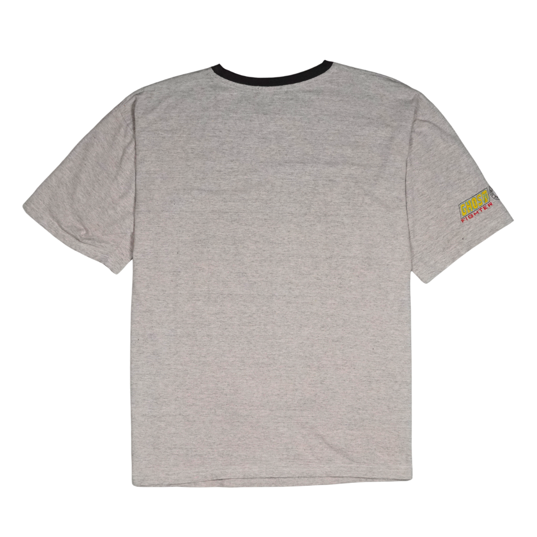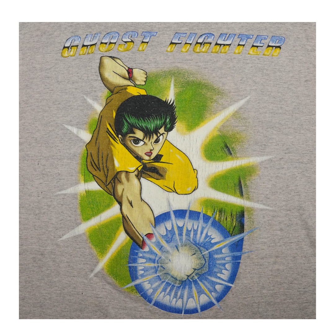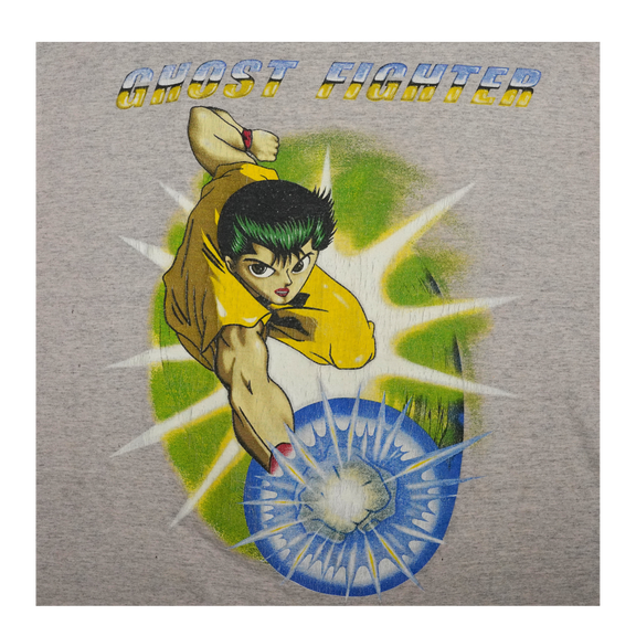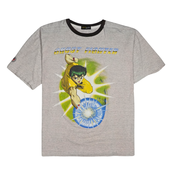This vintage Ghost Fighter tee captures the spirit of the cult-classic anime series, better known internationally as Yu Yu Hakusho. Printed on a heather gray ringer with bold black trim, the shirt features Yusuke Urameshi mid-attack, energy surging from his iconic Spirit Gun. The sleeve includes official Ghost Fighter embroidery, reinforcing its roots in the original licensed Philippine release that gave the series its “Ghost Fighter” name. A vibrant piece of anime history, this tee embodies the 90s wave of Japanese animation crossing into Southeast Asian and global pop culture. Essential for collectors chasing vintage anime apparel, it’s both nostalgic and authentic—perfect for showcasing your love of classic shonen energy.