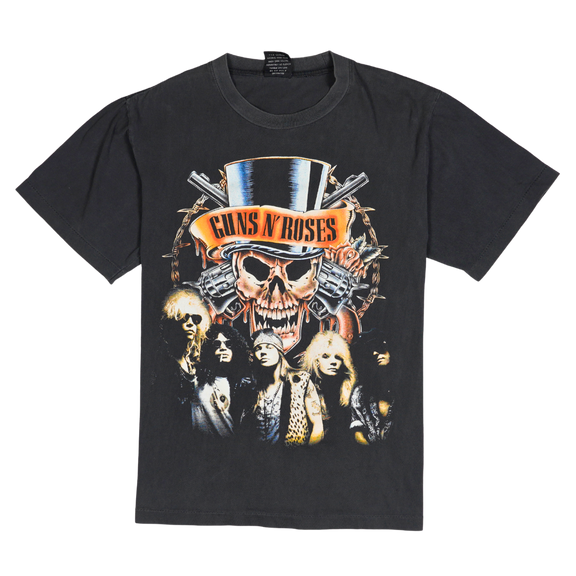 This vintage Guns N’ Roses tee embodies the raw sleaze-rock energy that made the band one of the biggest acts of the late ’80s and early ’90s. The front graphic explodes with an oversized skull in a top hat, flanked by crossed revolvers and a barbed rose wreath, with the classic Guns N’ Roses banner screaming across the forehead. Below, the band’s members — Axl, Slash, Duff, Izzy, and Steven — are rendered in high-contrast portrait style, capturing the swagger and excess of their Appetite for Destruction and Use Your Illusion eras.