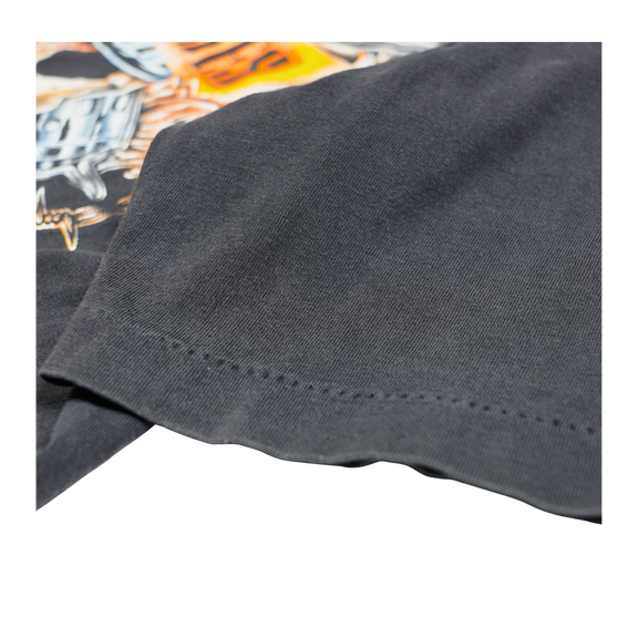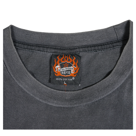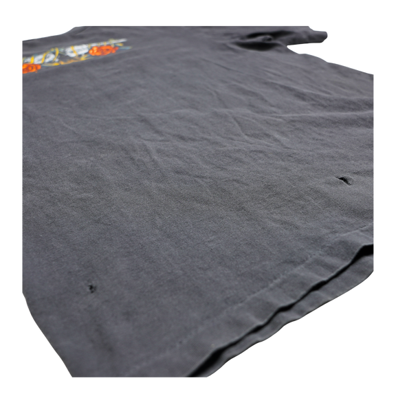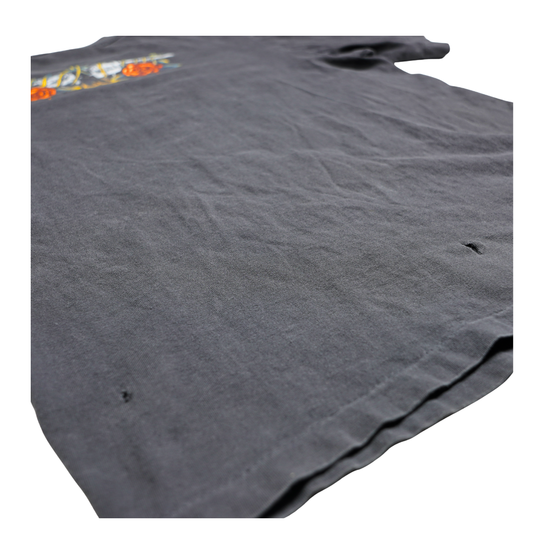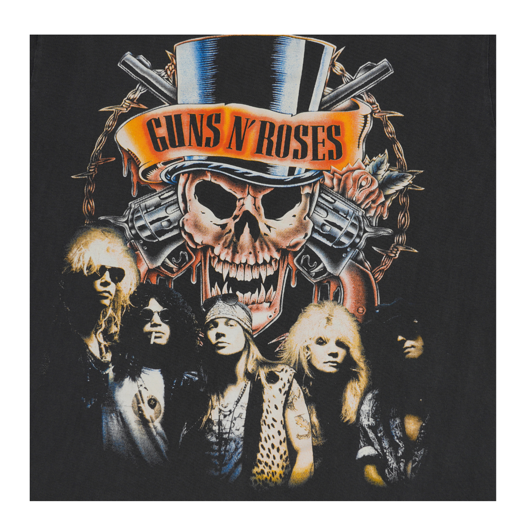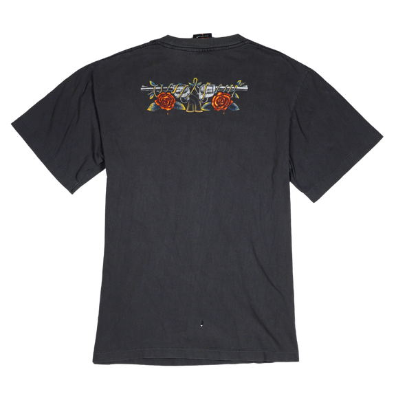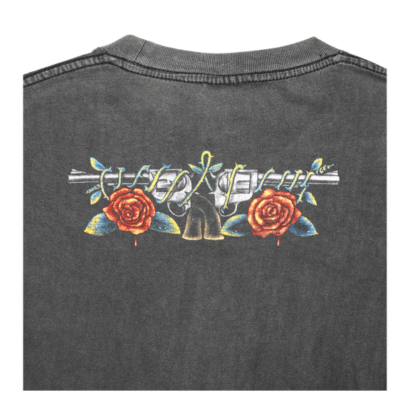 The back features a smaller but equally striking design: crossed pistols, roses, and dripping barbed wire, a nod to the band’s signature blend of beauty and brutality. Printed on a faded black blank with wear that adds character, this tee is pure rock history — a piece of merch that feels as dangerous as the band’s reputation.