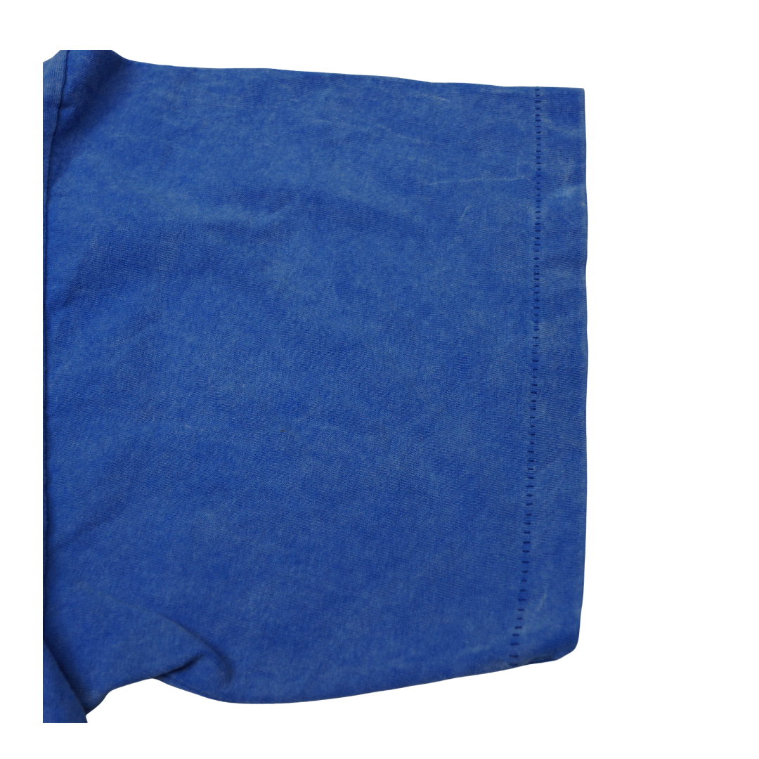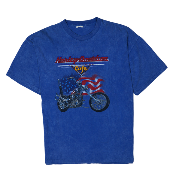 This vintage Harley-Davidson tee celebrates the legendary Las Vegas Cafe, a neon-lit shrine to American iron that roared down The Strip in the '90s. Front and center is a chromed-out chopper flying the stars and stripes, a tribute to the freedom and rebellion that define the Harley spirit. With bold graphics and classic red-white-and-blue Americana, it captures a moment when Vegas was wild and Harley ruled the open road. Perfect fade, true patina—this is more than a shirt, it’s a piece of motor history.