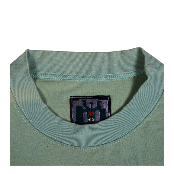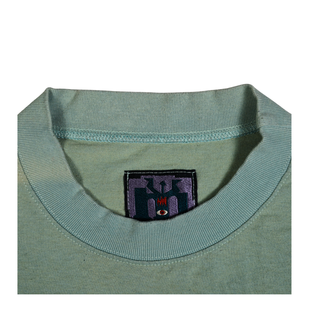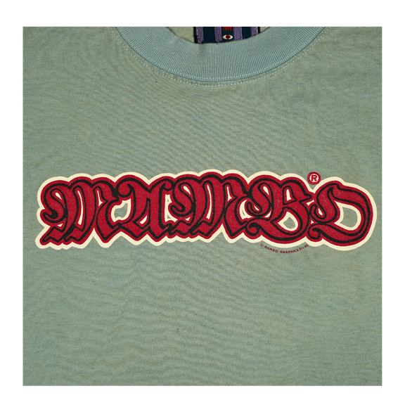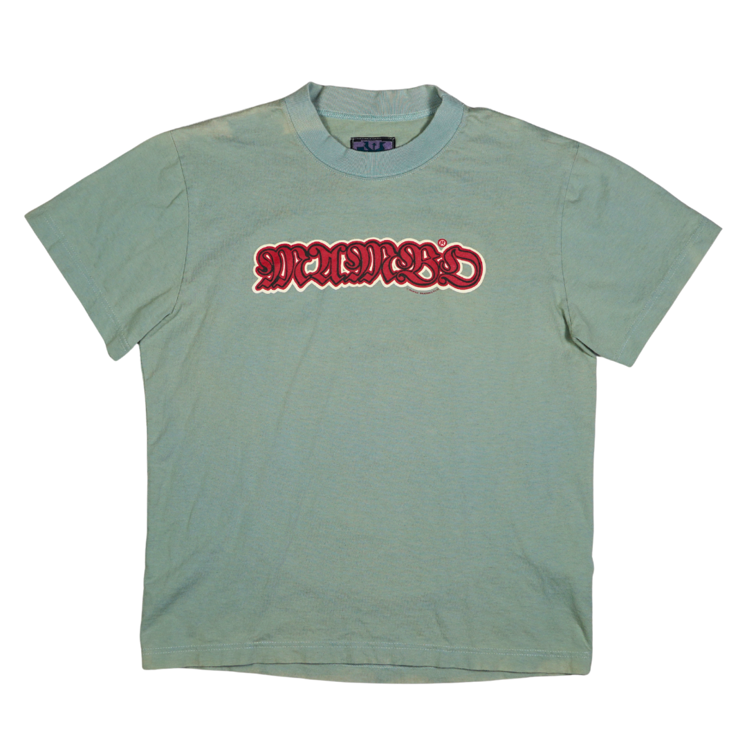 Printed on a faded seafoam green cotton blank with the original embroidered Mambo tag, this shirt is both a collector’s gem and a wearable piece of art. Perfect for fans of skate/surf culture, streetwear archivists, or anyone who appreciates irreverent vintage graphics that still hit hard today.