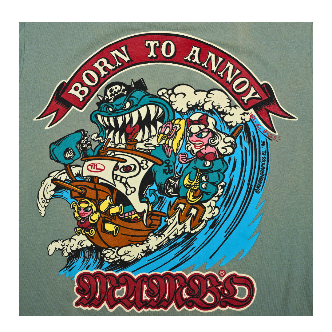 This vintage Mambo Graphics tee captures the anarchic humor and bold surf art style that defined the Australian streetwear label in the 1990s. The front keeps it simple with the classic Mambo logo in heavy red gothic lettering, but the back is where the shirt comes alive — a chaotic surf cartoon featuring an oversized shark, frantic characters, and the phrase Born to Annoy emblazoned across the top.