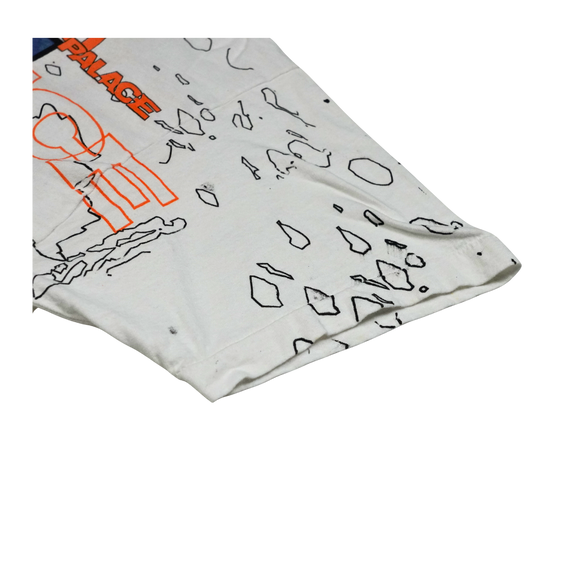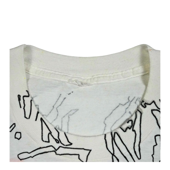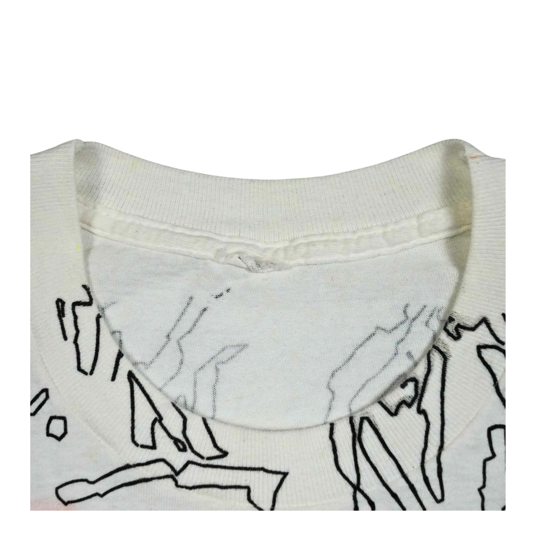 This vintage 1990s Palace Riu “Tower of Power” tee captures the bold experimental design language of the era. Featuring layered neon graphics, abstract line art, and surreal portraits in electric blue and orange, the shirt embodies the underground rave and streetwear aesthetic of the decade. The oversized all-over print makes it a true statement piece, reflecting Palace’s avant-garde approach to merging art and fashion. Constructed from soft cotton with a lived-in feel, this vintage tee speaks to the energy of early club culture and graphic experimentation. A rare find for collectors who appreciate authentic 1990s design and the cultural crossover between music, art, and fashion.