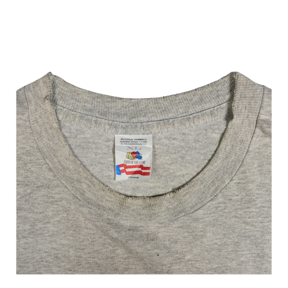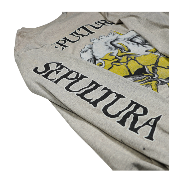 This vintage 1990s Sepultura Chaos A.D. long sleeve tour tee is a brutal relic from the golden era of Brazilian thrash metal. Featuring the cracked heart artwork on the front with thorn-like yellow accents and “CHAOS A.D.” blasting across the back, it embodies the raw aggression of the band’s fifth studio album—a record that shifted the genre with its mix of groove and hardcore influences. Sepultura’s name runs boldly down both sleeves, cementing this as a piece meant for die-hard fans in the pit. Printed on a heather grey Fruit of the Loom tag, this shirt dates squarely to the mid-90s, when Chaos A.D. was taking over global stages and influencing the metal underground. A true collector’s piece, it reflects not just the music but the cultural wave Sepultura carried worldwide during one of their most impactful eras.