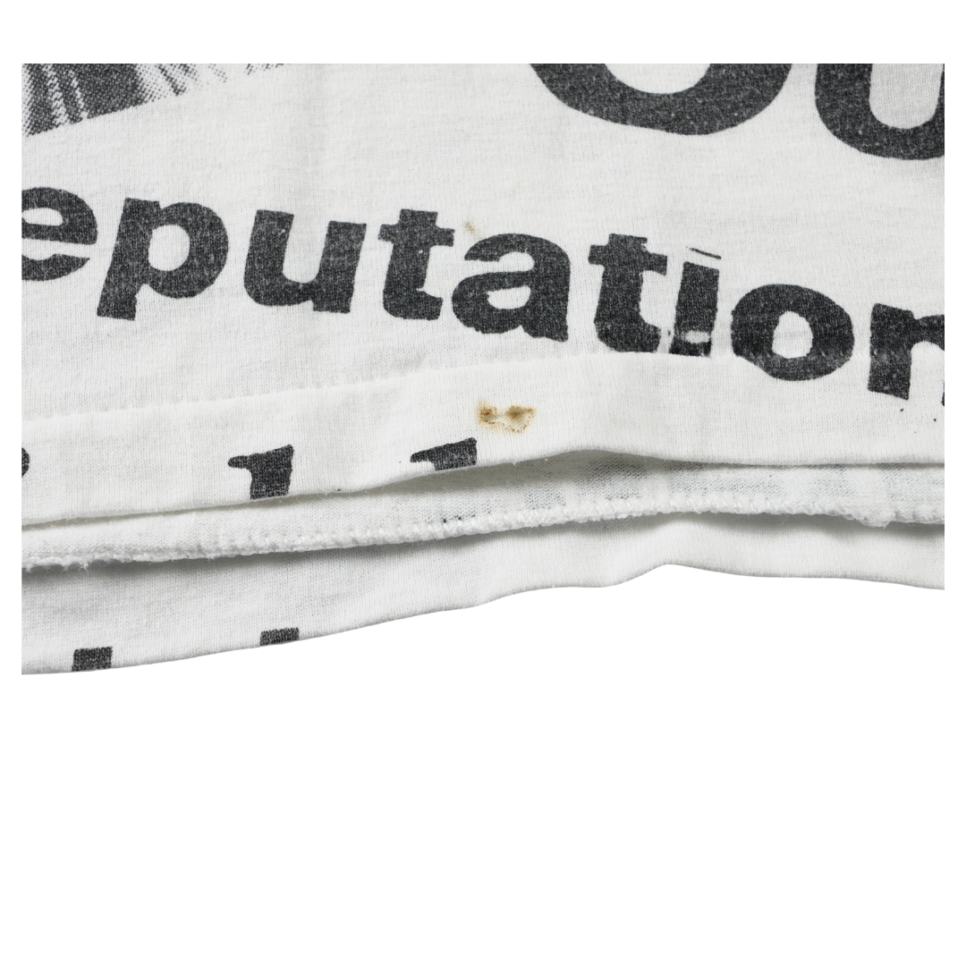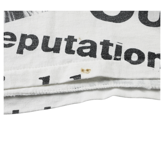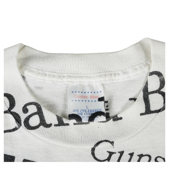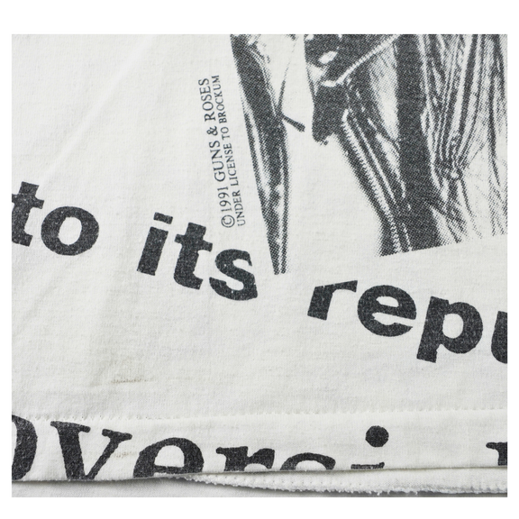 This 1991 Guns N’ Roses vintage tee captures the chaotic energy of the band’s wildest era in full-throttle, all-over print. Designed like a punk tabloid fever dream, the shirt features a newspaper-style collage of bold black headlines, paired with a gritty grayscale band photo on the front. The back continues the media blitz, slamming phrases like “IF GUNS N’ ROSES ARE OUTLAWED...” across every inch. Every detail on this shirt screams rebellion.