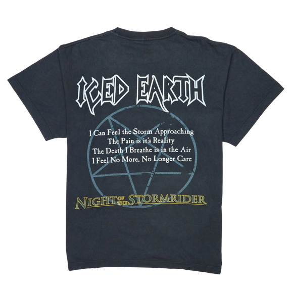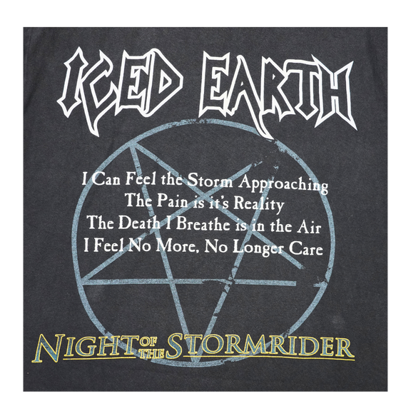 A storm brews in the distance, and the Night of the Stormrider is upon us. This vintage Iced Earth tour tee from 1991 captures the fury and fantasy of one of metal's most underrated concept albums. On the front, an electrified warrior cloaked in thunder rides through chaos, sword raised, ready to carve his name in legend. The iconic Iced Earth logo looms above in jagged white, while below, "Night of the Stormrider" screams across in distressed yellow gothic font. The reverse side hits even harder — printed over a pale pentagram are haunting lyrics from the title track, echoing with doom and detachment: “I can feel the storm approaching...”