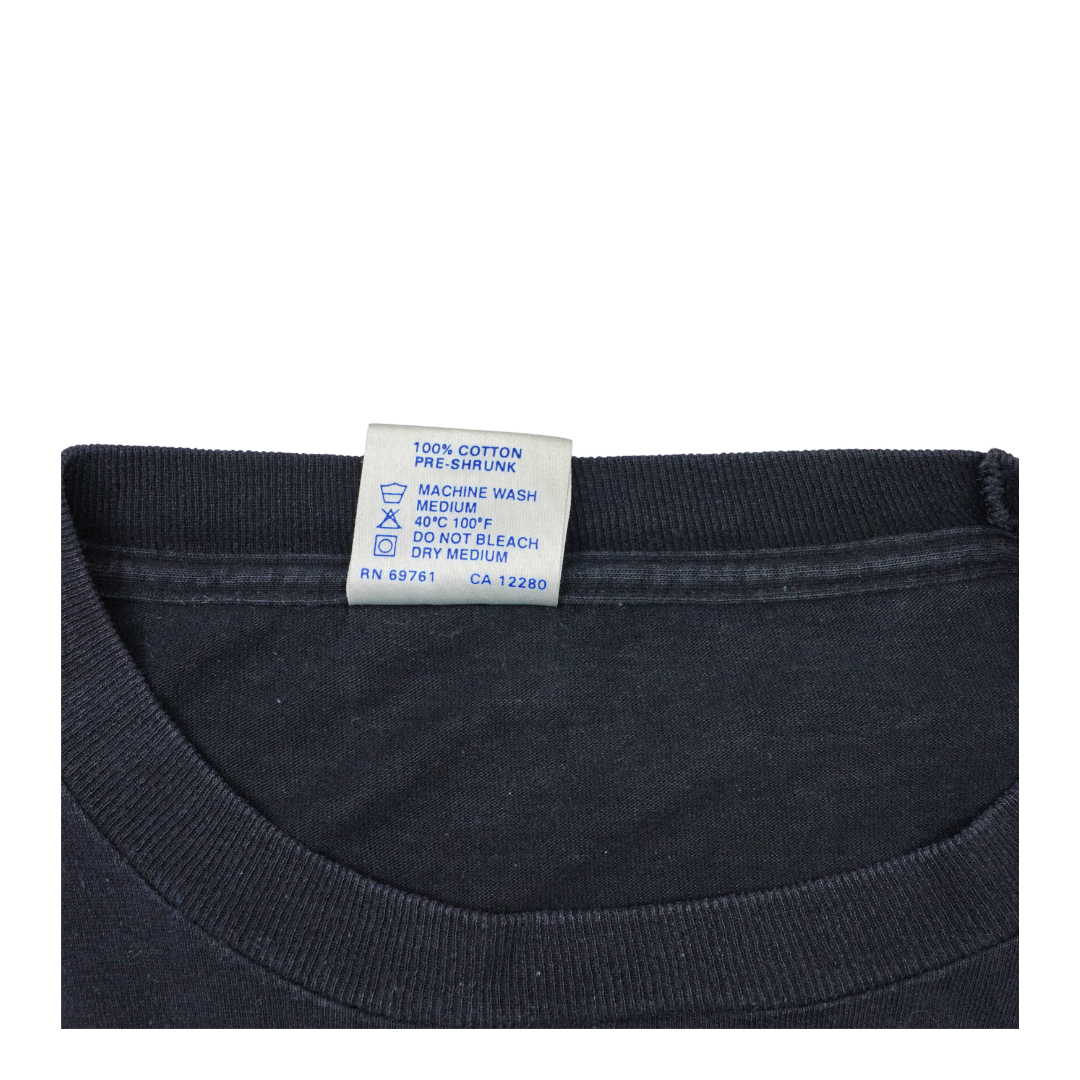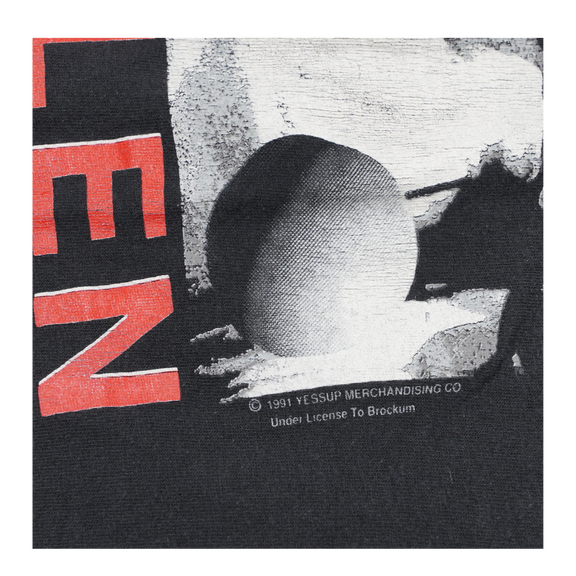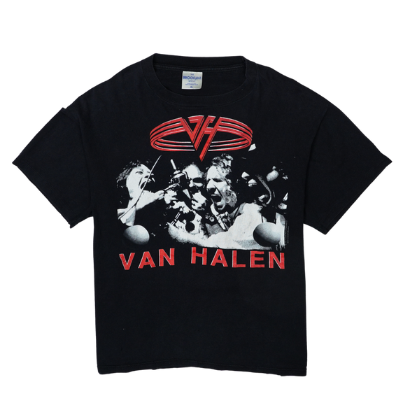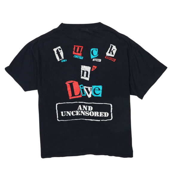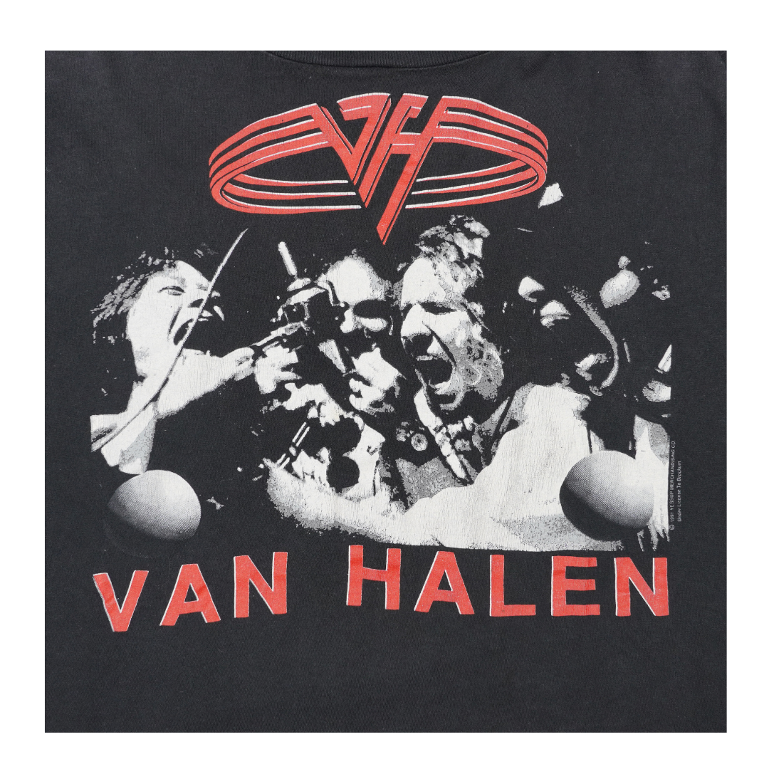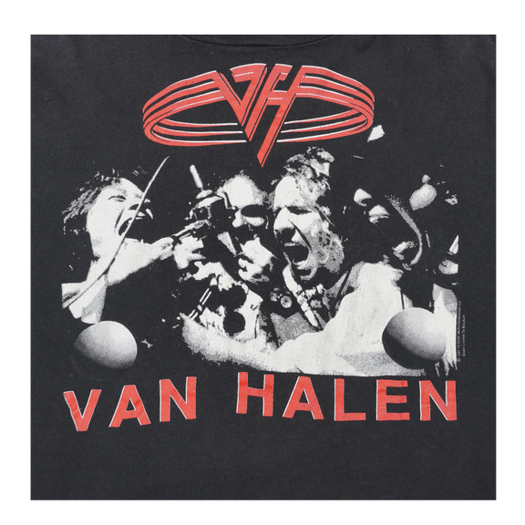 This vintage Van Halen tee captures the explosive energy of their 1991 Fuck ‘n’ Live and Uncensored tour—a raw, no-holds-barred era that celebrated the band's unfiltered stage presence. Featuring a chaotic black-and-white graphic of the band mid-performance, this shirt channels the electrifying intensity that defined Van Halen’s live shows in the early '90s. The back print leans full punk attitude, spelling out the tour’s bold title with ransom-note lettering—each cutout a rebellious nod to the band's refusal to conform.