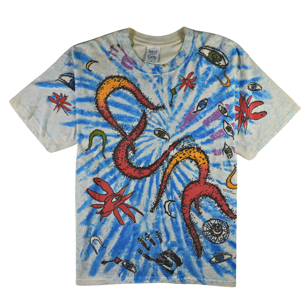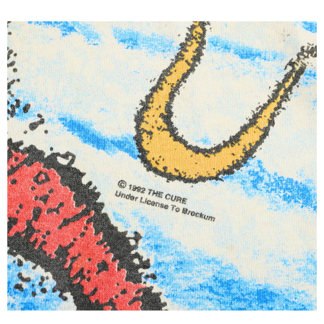 This vintage 1992 The Cure tee is a vibrant explosion of psychedelia, originally released under license to Brockum and printed on a classic Wild Oats tag. Featuring an all-over print with swirling tentacles, surrealist eyes, flowers, moons, and abstract forms, this shirt channels the band’s post-punk dreamscape aesthetic in full force. The tie-dye backdrop adds electric energy, with the same intricate design on front and back — a rarity in vintage rock tees. Made in USA from 100% pre-shrunk cotton, this officially licensed vintage gem perfectly embodies The Cure’s visual era in the early ‘90s. A grail for collectors and fans of abstract vintage music tees.