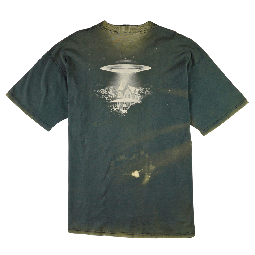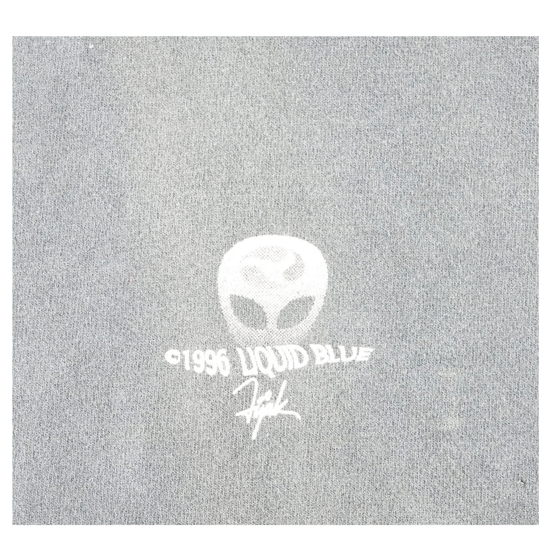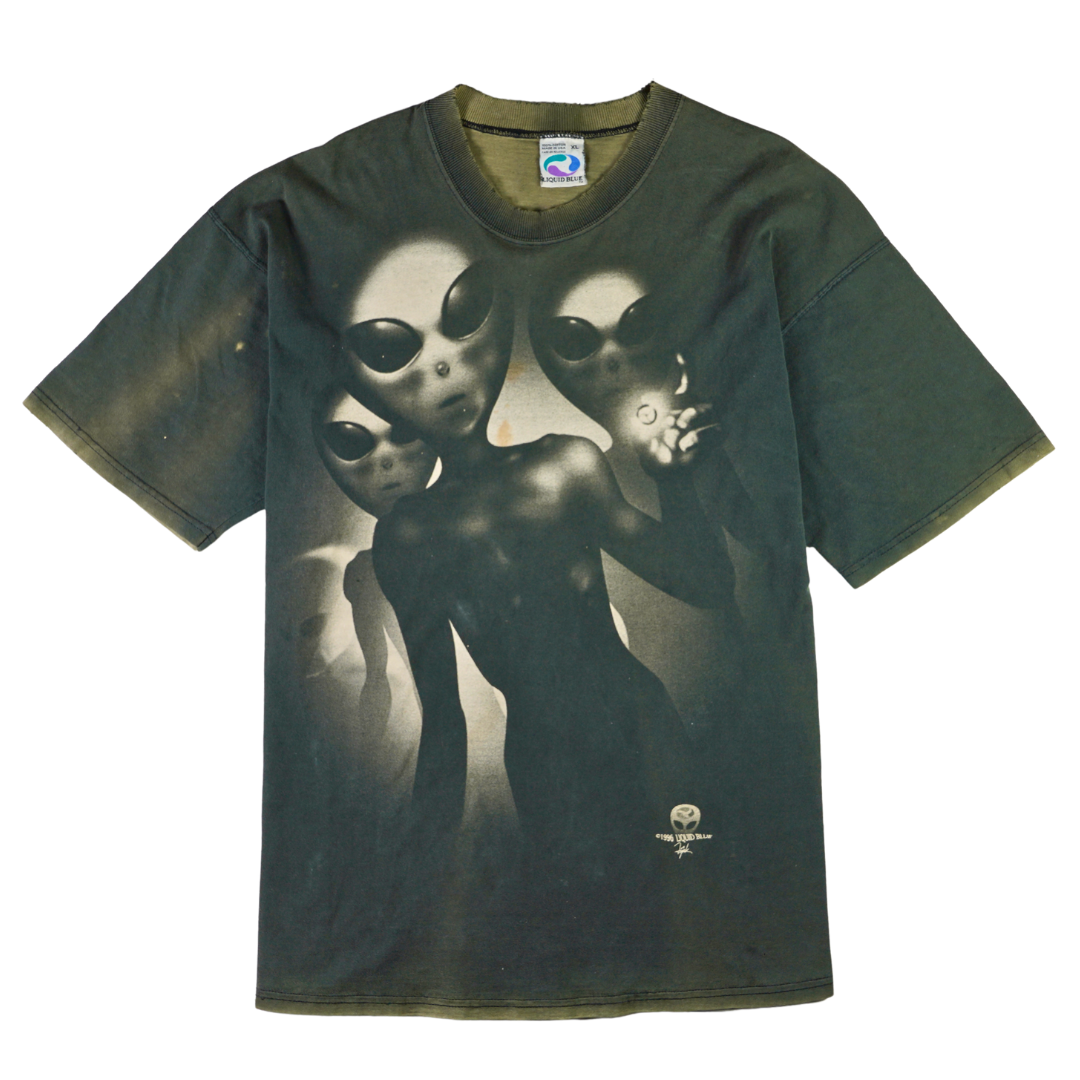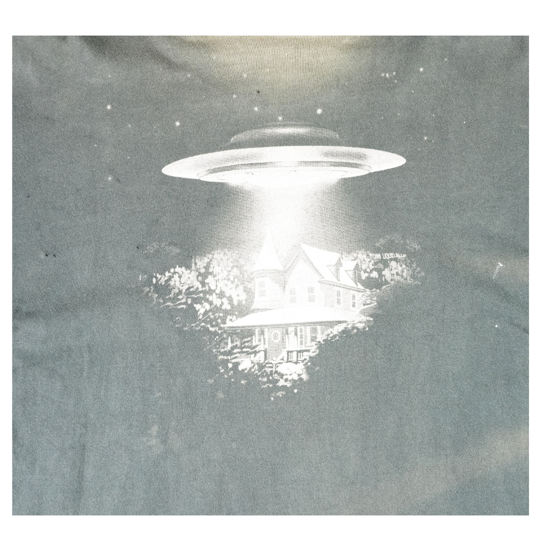 Step into a scene straight from a sci-fi dreamscape with this vintage 1996 Liquid Blue tee. The front features eerie greyscale aliens emerging from the shadows, while the back shows a UFO beaming up a Victorian-style home — a cult abduction motif that defined '90s conspiracy culture. Printed on 100% cotton Liquid Blue tag and made in the USA, this shirt blends vivid surrealism with premium build. The fade, bleach wear, and cracking only enhance its vintage authenticity. In person, the bleach hits are perfectly placed — they give this piece extra dimension and energy, elevating it beyond a clean version. This shirt is straight-up dope.