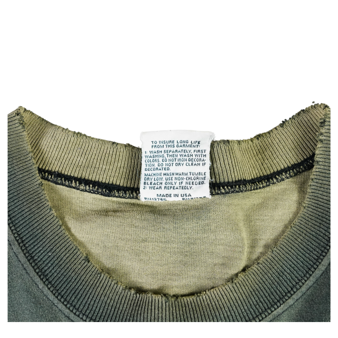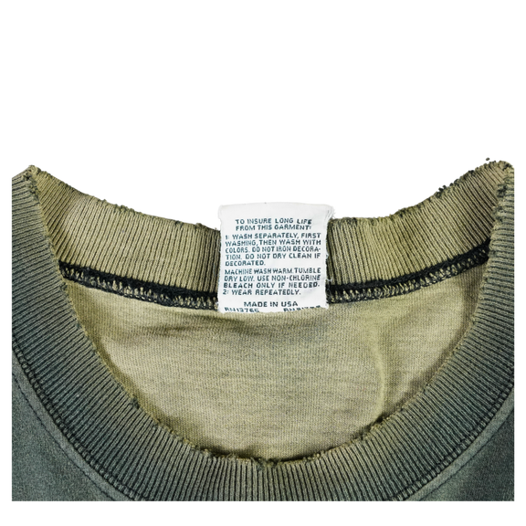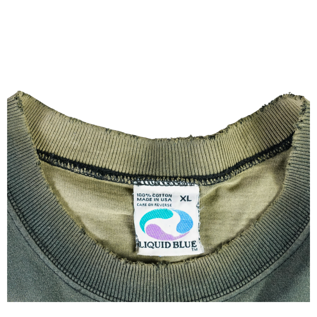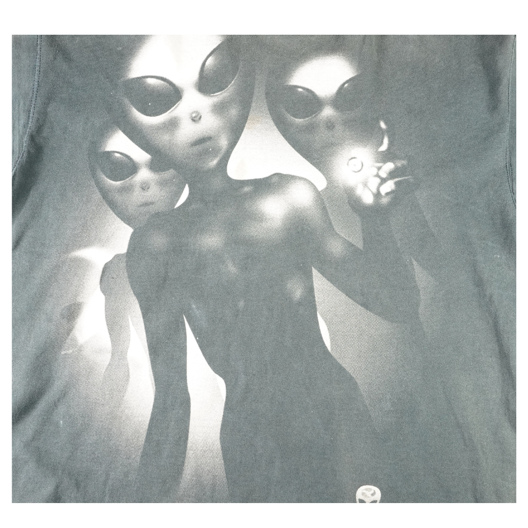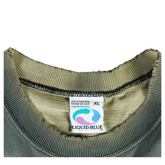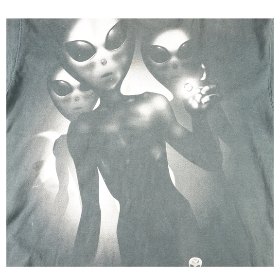 Step into a scene straight from a sci-fi dreamscape with this vintage 1996 Liquid Blue tee. The front features eerie greyscale aliens emerging from the shadows, while the back shows a UFO beaming up a Victorian-style home — a cult abduction motif that defined '90s conspiracy culture. Printed on 100% cotton Liquid Blue tag and made in the USA, this shirt blends vivid surrealism with premium build. The fade, bleach wear, and cracking only enhance its vintage authenticity. In person, the bleach hits are perfectly placed — they give this piece extra dimension and energy, elevating it beyond a clean version. This shirt is straight-up dope.
