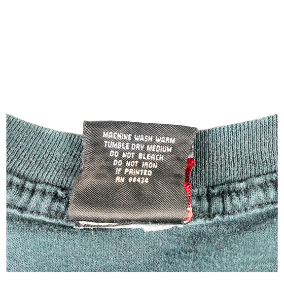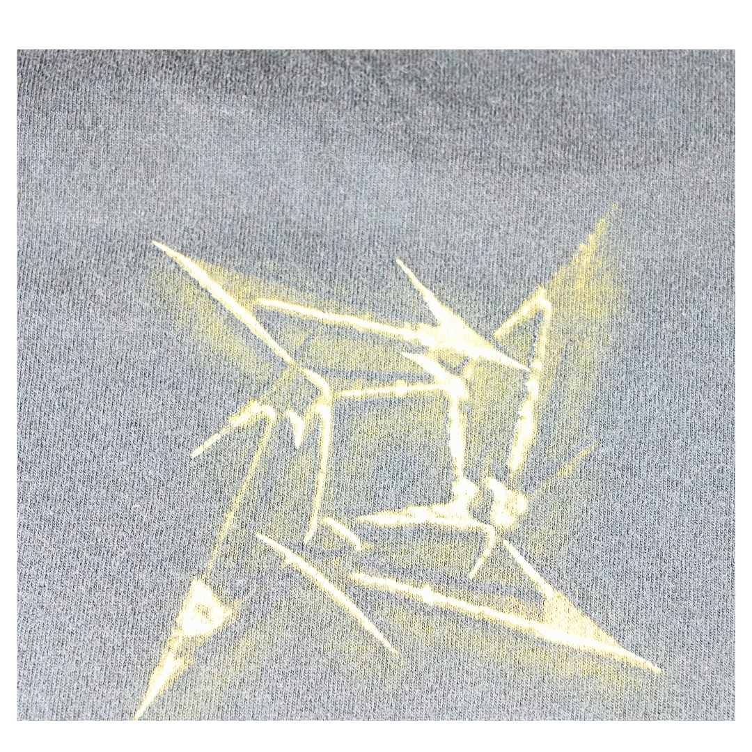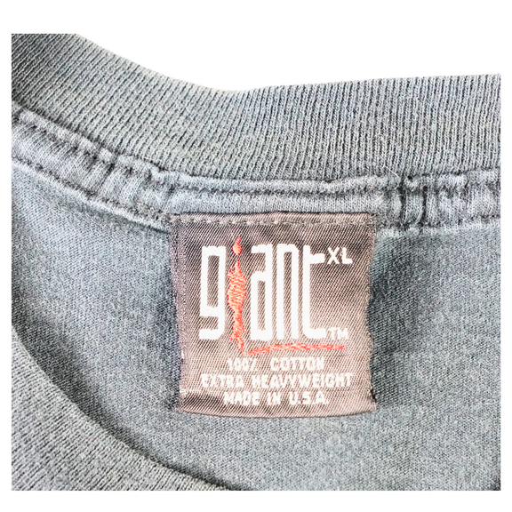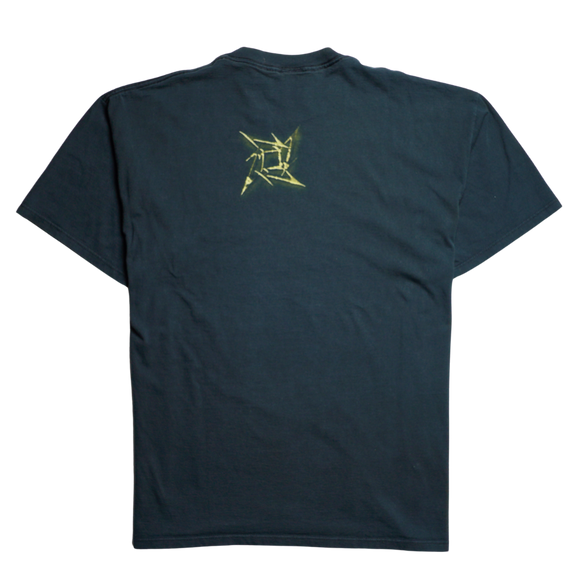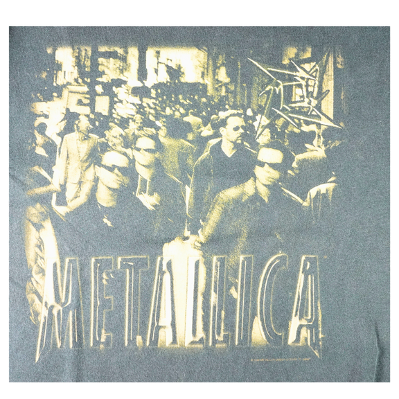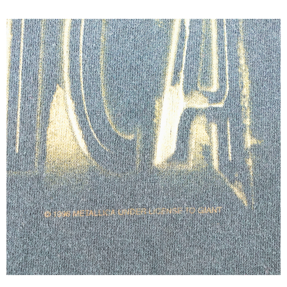 A gritty classic straight from the heart of the '90s metal scene. This vintage 1996 Metallica tee features the haunting “crowd scene” graphic with distorted urban imagery and the band’s logo stretching across the bottom in bold, industrial lettering. The back showcases the iconic Metallica ninja star logo in yellow. Printed on a heavyweight Giant tag tee, made in the USA, and licensed to Giant. A certified piece of metal history with natural fading that only makes it better with age.