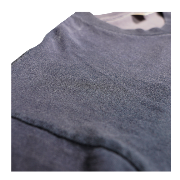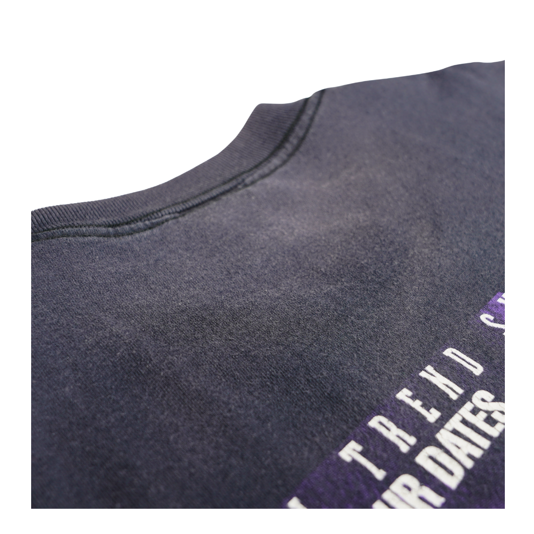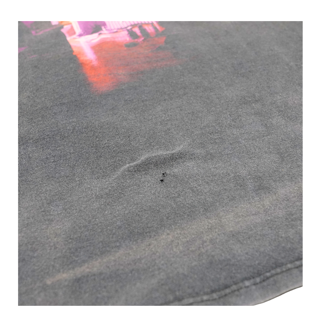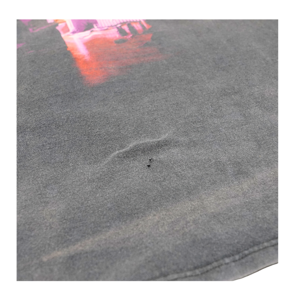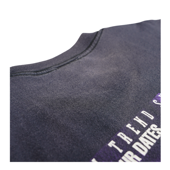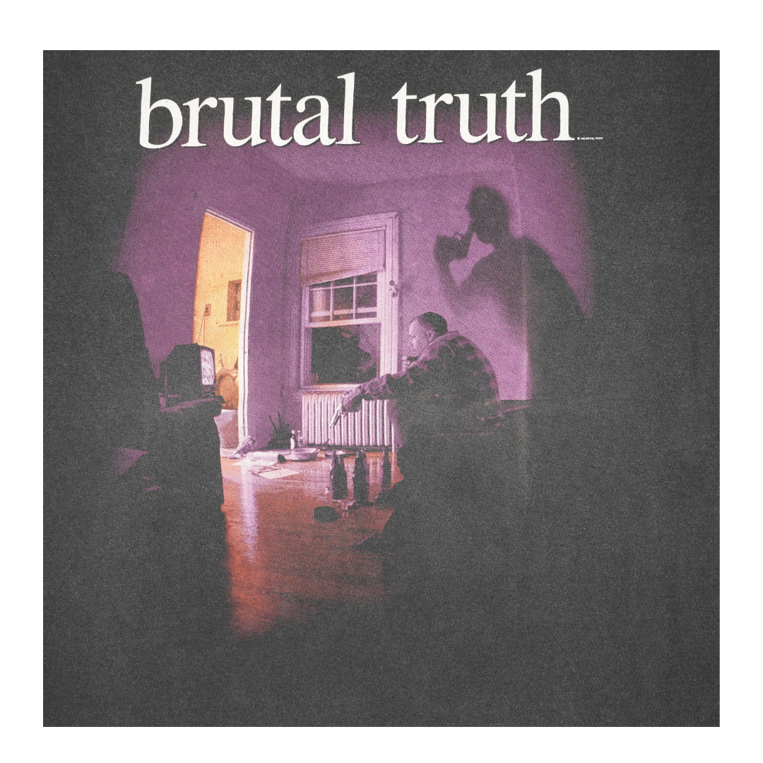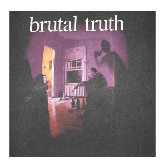 This vintage Brutal Truth tee comes straight from the grindcore underground, commemorating the band’s Kill Trend Suicide tour in 1997. The front graphic is soaked in stark purple tones, showing a distorted domestic scene with shadows looming over a man seated in isolation — a visual metaphor for the band’s raw commentary on modern despair. The minimalist lowercase logo floats above the chaos, setting the tone for the abrasive yet socially charged music Brutal Truth was unleashing at the time.