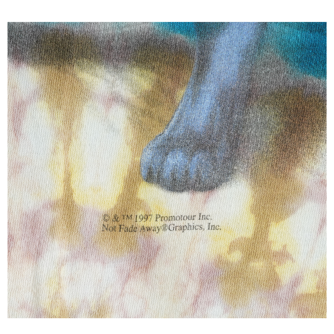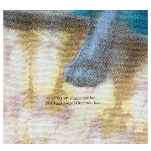 Printed on a beautifully faded all-over tie-dye blank with the original 1997 copyright by Promotour Inc. and Not Fade Away Graphics, this is the real deal—not a reprint. The tag has worn away with age, but the stitching and softness confirm this tee's authenticity. With single-stitch hems and vibrant art that still pops, this piece is pure vintage rock history.