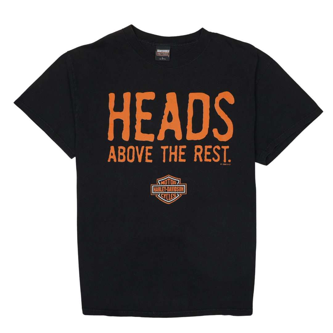 This vintage Harley-Davidson tee from 1998 doesn’t whisper attitude — it shouts it in bold orange. With the thunderous phrase “HEADS ABOVE THE REST” blazing across the chest above the iconic bar-and-shield logo, this shirt captures the rebellious confidence of the Harley spirit in its purest form. It’s the kind of tee you’d find on the back of someone leading the pack down Route 66, face in the wind, no apologies in sight.