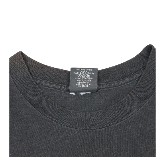 Printed on a perfectly faded black blank and made in the USA, the heavyweight cotton is soft from decades of wear, yet still tough as asphalt. No graphic on the back — because this shirt doesn’t need one. It makes its point from the front, then lets the engine do the rest of the talking.