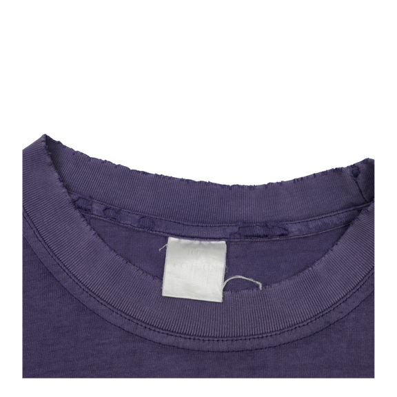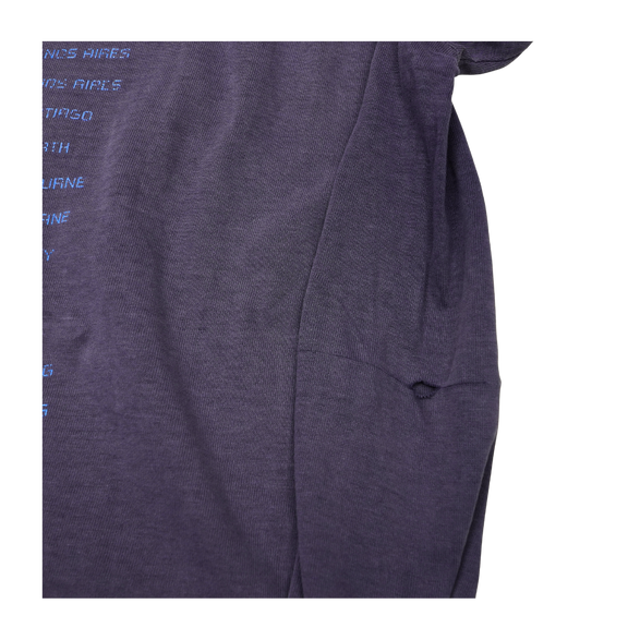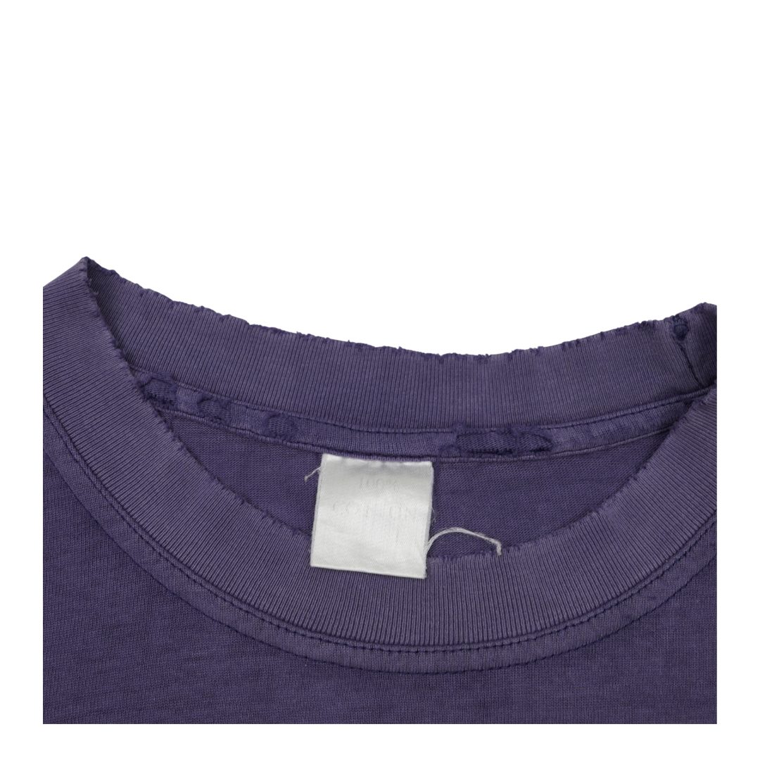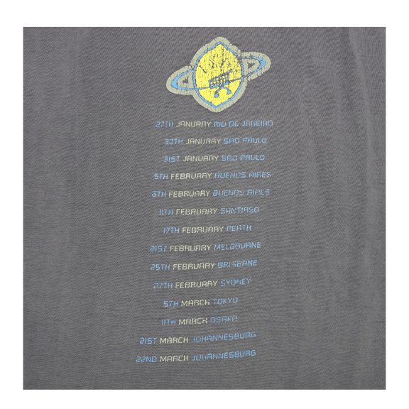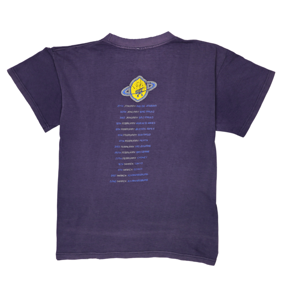 This vintage U2 tee is a vibrant artifact from their legendary 1998 PopMart Tour, the band’s most ambitious and theatrical production to date. The front graphic features the unmistakable yellow lemon orbiting like a planet—a surreal emblem born from the PopMart stage show where the band famously emerged from a giant lemon. On the back, a crisp list of international tour stops traces U2’s journey through Rio, Tokyo, Johannesburg, and beyond, reflecting the global scale of this high-concept spectacle. The graphic shows natural cracking that adds to its lived-in charm, while the faded purple cotton and minor wear speak to nights of sound and spectacle. A true vintage piece from U2’s most daring era.