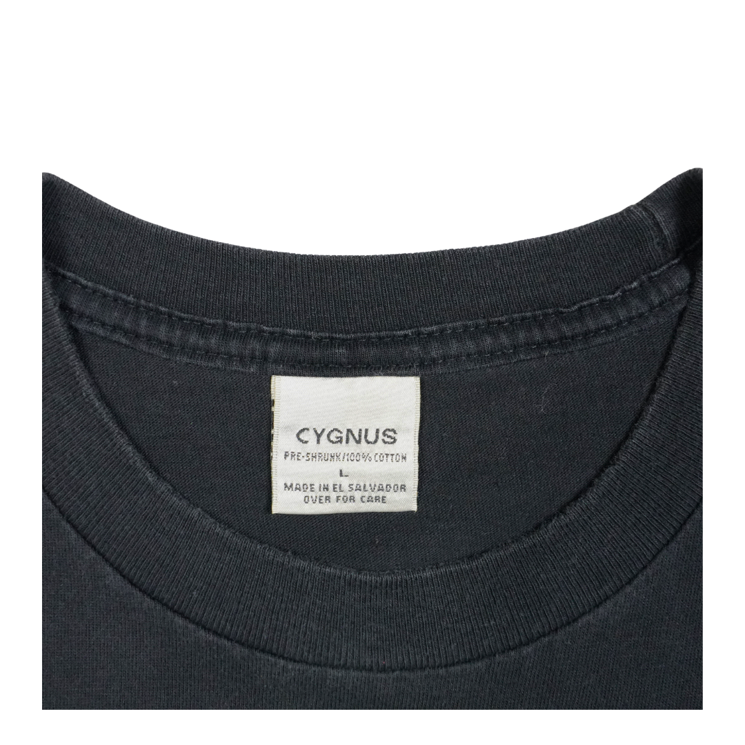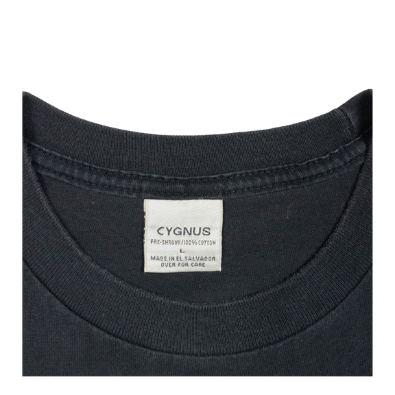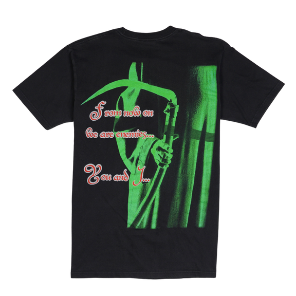 This vintage 1999 Children of Bodom Hatebreeder tee captures the band’s iconic Grim Reaper mascot in a striking neon green design, front and back. Released with the second studio album that cemented Bodom’s place in melodic death metal, the shirt features the eerie “From now on we are enemies... You and I...” lyric graphic on the reverse. Printed on a Cygnus tag, made in El Salvador, this piece embodies late-90s metal merch aesthetics with bold oversized prints and dark, theatrical flair. A true vintage staple for fans of Alexi Laiho’s legendary guitar work and anyone collecting authentic extreme metal history.