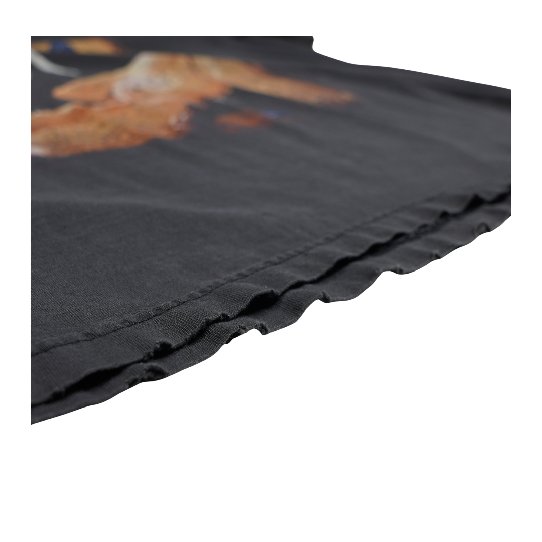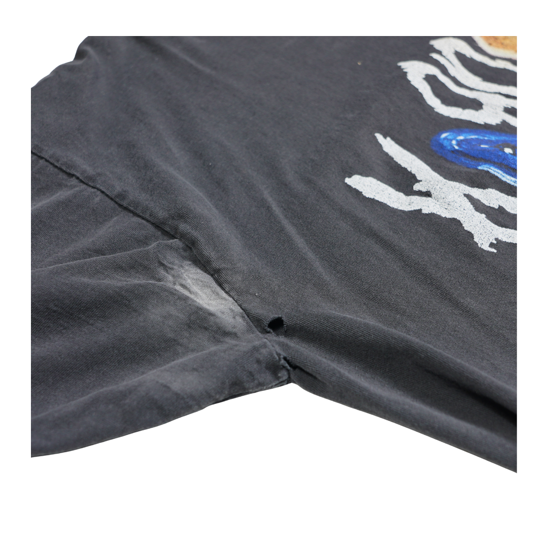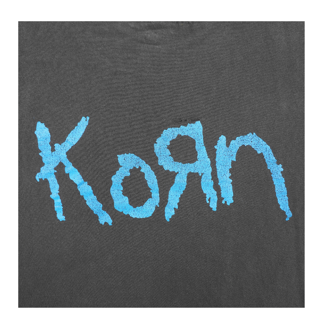This vintage 1999 Korn Issues tee immortalizes the band’s dark nu-metal aesthetic with one of their most recognizable visuals — the stitched-up voodoo doll artwork from the platinum-selling album. Released at the height of Korn’s dominance in the late ’90s, Issues debuted at No. 1 on the Billboard 200, cementing their place in heavy music history. The front graphic features the distressed ragdoll with its blue button eye, a symbol of the band’s tortured, emotional energy, while the back showcases the iconic Korn logo in bold blue. Printed on a P.K Sports tag, this shirt embodies the raw angst and alternative edge of the nu-metal era. A true collector’s piece, this vintage Korn tee captures the era when the band defined a generation’s sound and aesthetic.