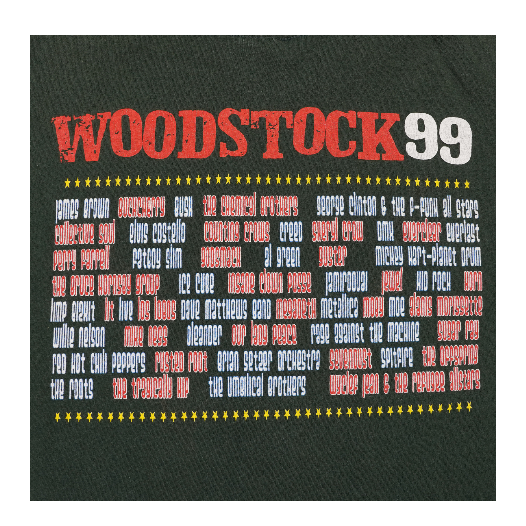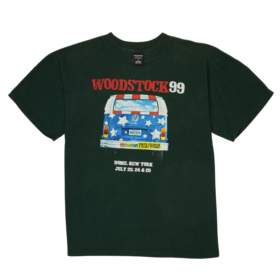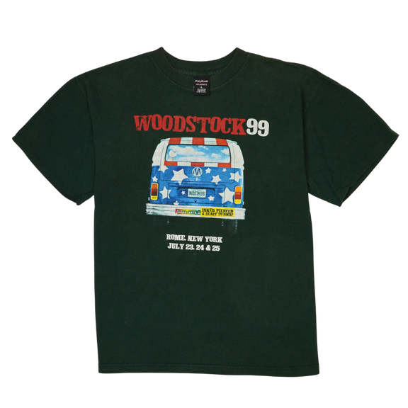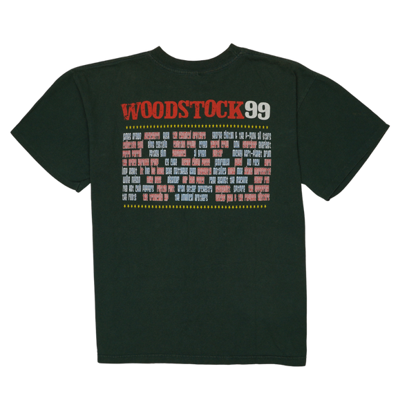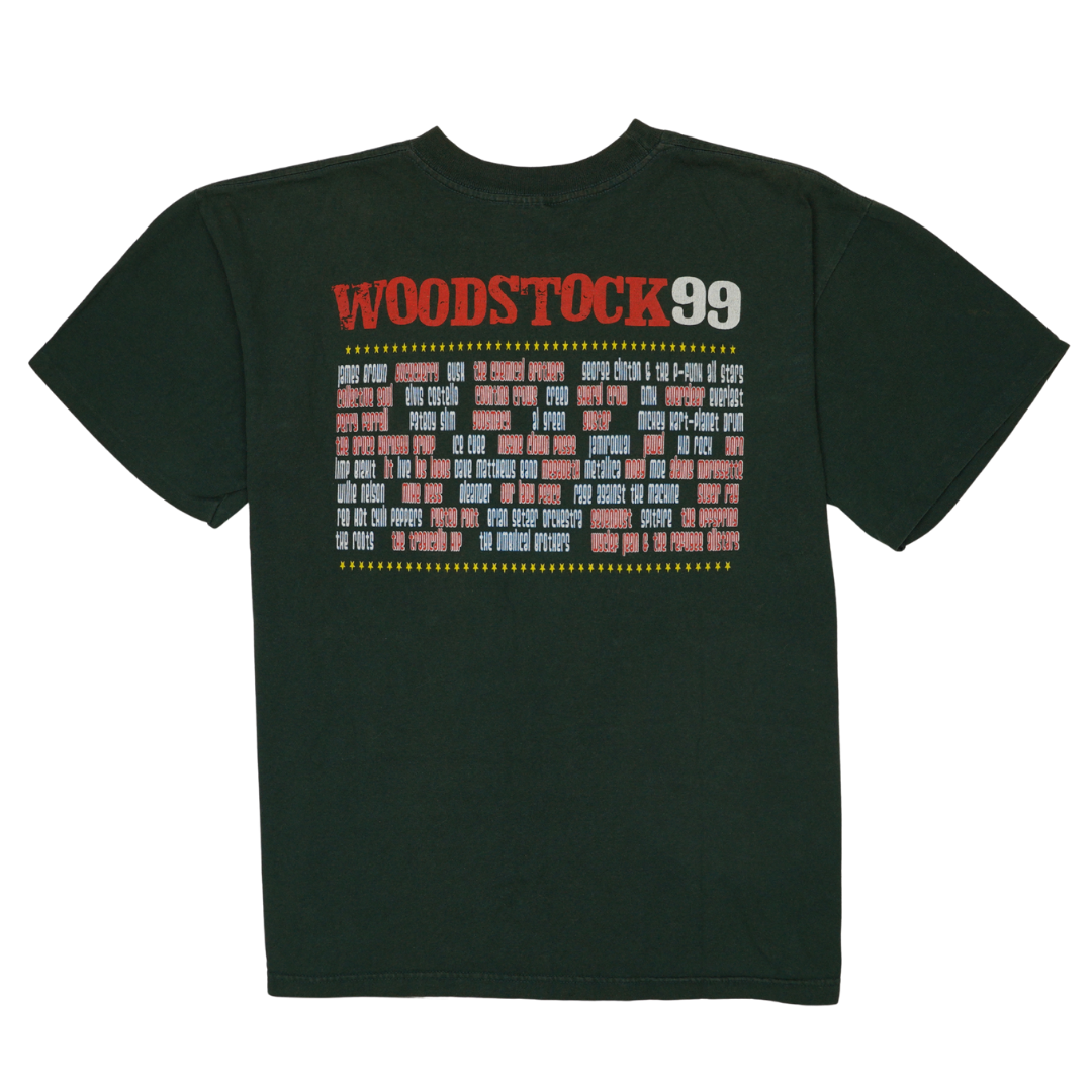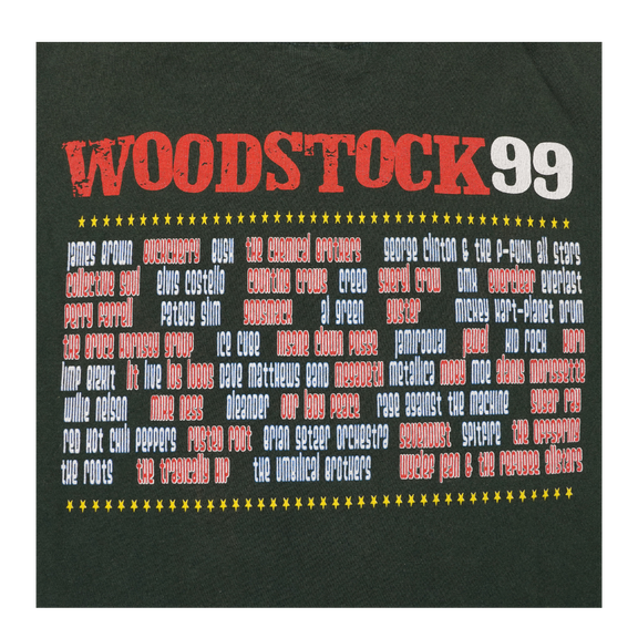A symbol of peace, rebellion, and pure chaos — this vintage Woodstock '99 tee captures the paradox of a generation’s last great attempt at revival. Printed with an American flag–themed VW van rolling into Rome, New York, the shirt celebrates the infamous three-day festival that brought together Metallica, Limp Bizkit, Rage Against the Machine, and hundreds of thousands of restless souls. The back of the shirt reads like a mixtape of ’90s legends — every name a memory, every font a flashback.