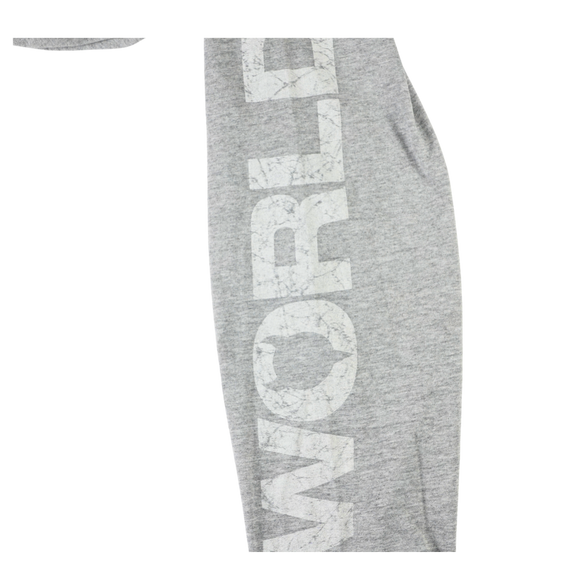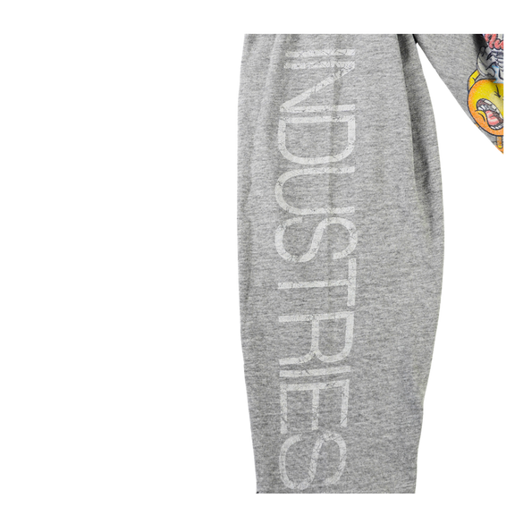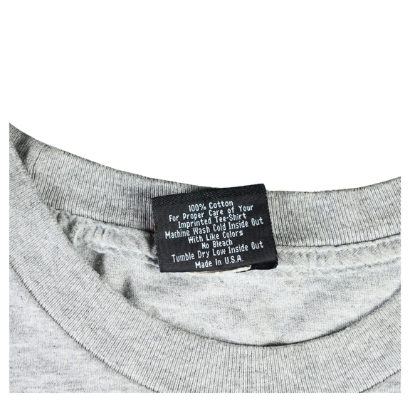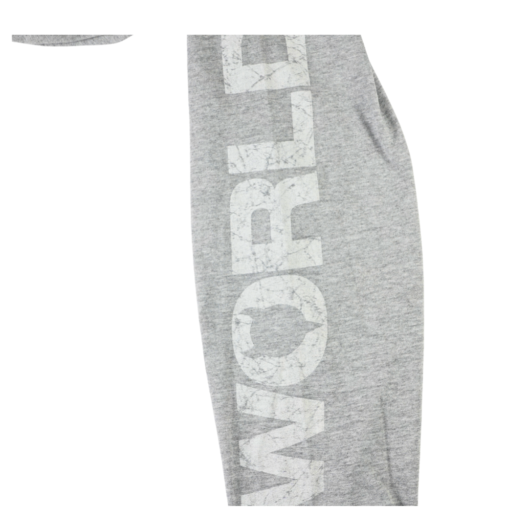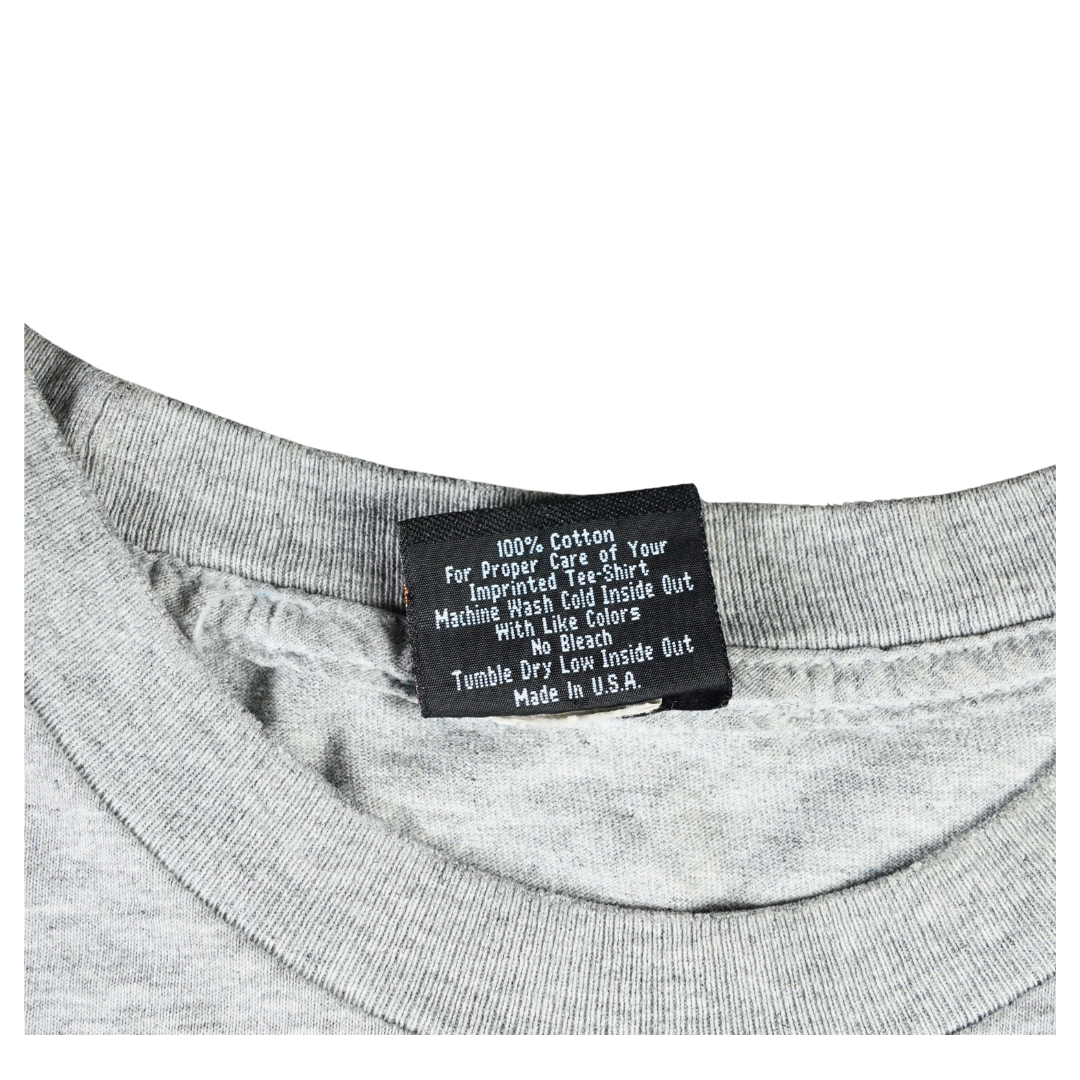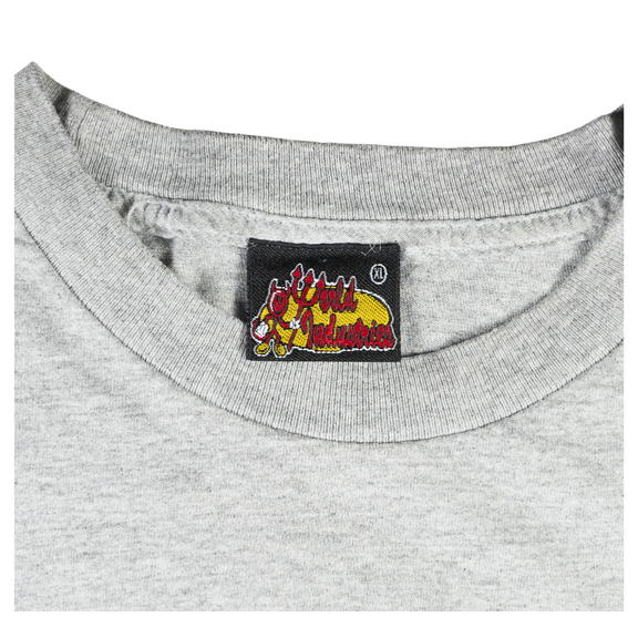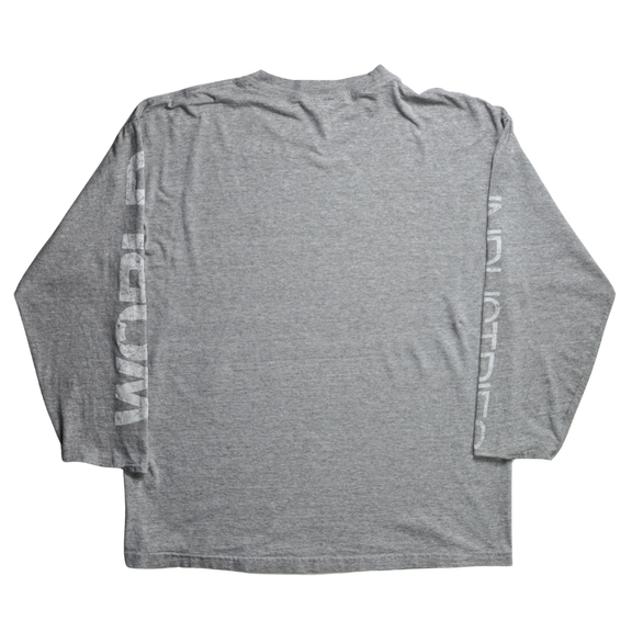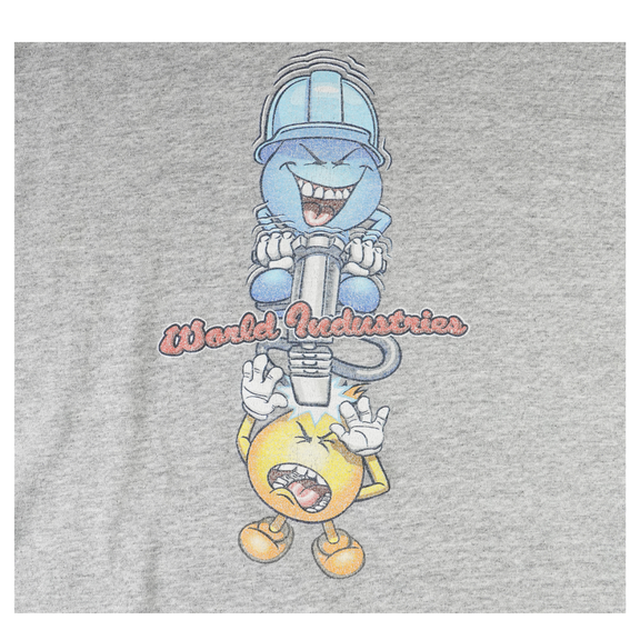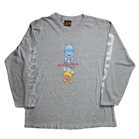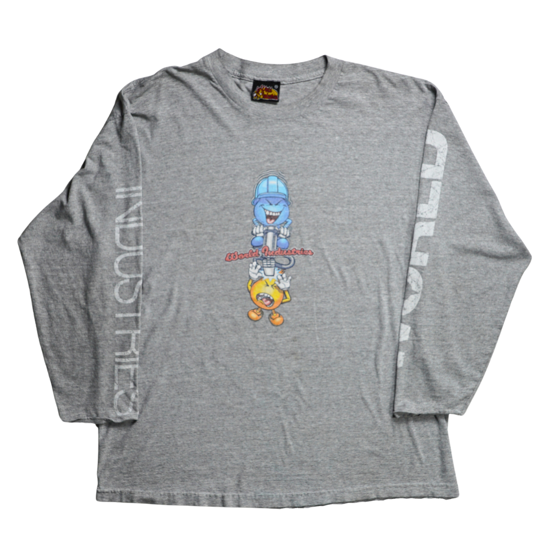 Straight from the peak of late-’90s skate culture comes this iconic 1999 World Industries tee, featuring Flame Boy and Wet Willy locked in chaotic cartoon combat. The crisp heather gray cotton is softened by time, while the bold front graphic still pops. “World” and “Industries” stretch in cracked white ink down each sleeve, a throwback to the brand’s rebellious edge. Double-tagged, made in USA, and cut in a roomy XL, this long sleeve channels the golden years of mall skate shops and Tech Decks on lunch tables.