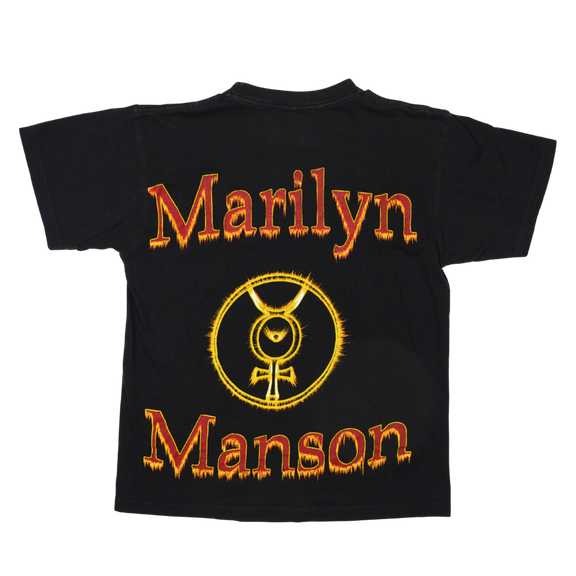 This vintage Marilyn Manson tee is a full frontal blast of early 2000s industrial shock. With Manson locked in a straightjacket, staring straight through you in a haze of green smoke, this graphic is textbook Antichrist energy. The distressed flame-text logo drips in blood red, while the back features the infamous occult insignia — equal parts chaos and control, rebellion and ritual.
