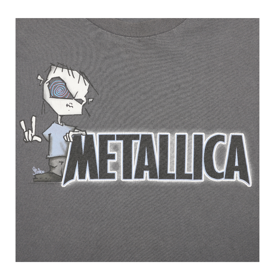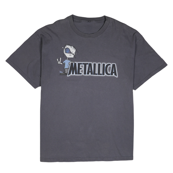 This vintage 2000s Metallica tee carries the unmistakable Pushead influence, with a warped cartoon alien giving a peace sign next to the band’s bold logo. Known for his long-running collaboration with Metallica, Pushead’s artwork pushed heavy metal visuals into surreal, underground territory. Shirts like this one capture that era when Metallica embraced not only aggressive thrash roots but also a broader cultural identity, appealing to skaters, metalheads, and fans of outsider art. The alien character’s hypnotic eyes and jagged style are instantly recognizable as part of Pushead’s twisted aesthetic, making it more than just a band shirt—it’s a piece of visual storytelling tied to one of the biggest names in metal. For collectors of vintage Metallica, this shirt embodies the crossover of music, art, and subculture that defined the 2000s.