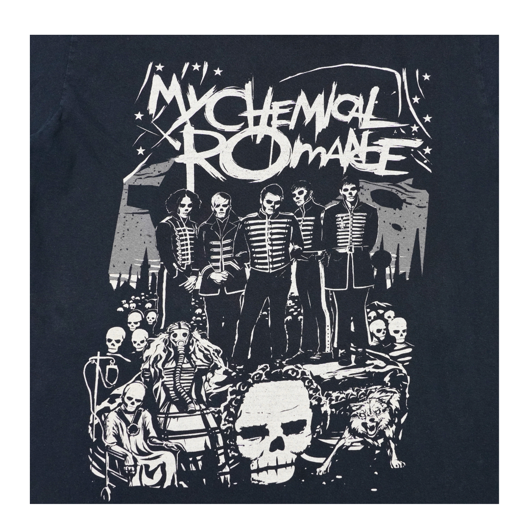 This vintage My Chemical Romance tee is pure emo gold — a relic from the band’s theatrical Black Parade era. The graphic explodes with life (and death), featuring the band in their iconic military garb, standing among a grim cast of skeletons, wolves, and eerie figures. At the center, a massive skull watches over the parade of misfits, capturing the essence of MCR’s gothic grandeur.