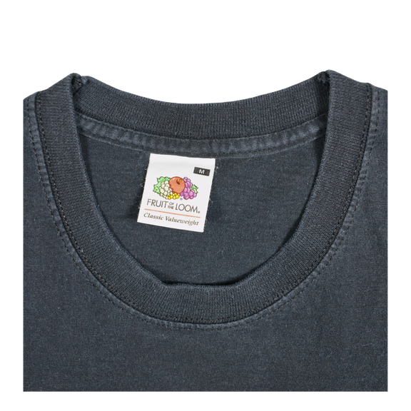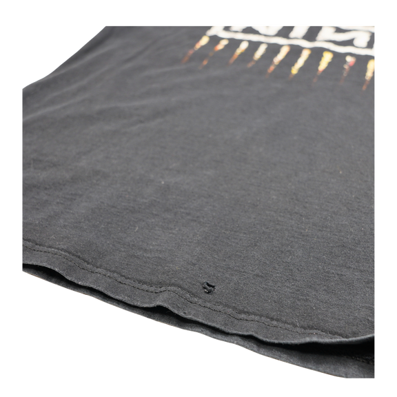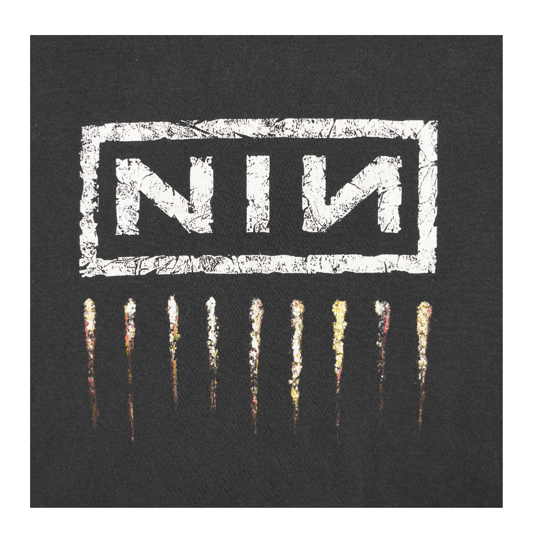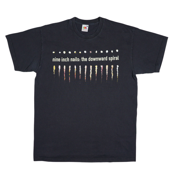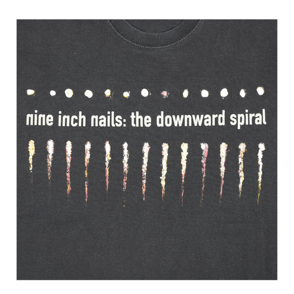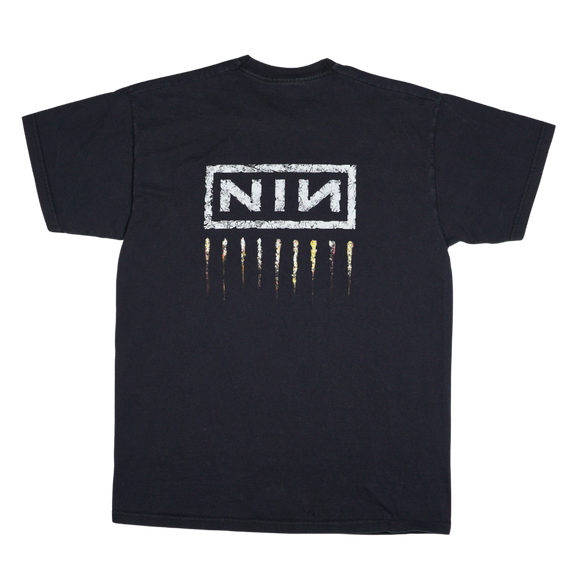 This vintage Nine Inch Nails tee throws you straight into the industrial chaos of The Downward Spiral. Printed on a 2000s Fruit of the Loom blank, it features the haunting vertical scratch motif from Trent Reznor’s career-defining 1994 album. The minimalist front text—“nine inch nails: the downward spiral”—sits above distressed streaks of color, while the back anchors the design with the iconic NIN logo over fractured textures. Widely regarded as one of the most influential records of the 1990s, The Downward Spiral pushed industrial rock into the mainstream and cemented NIN’s place in alternative culture. This vintage piece embodies that era’s bleak aesthetic, carrying both the weight of its artwork and the underground energy of fans who wore it in the pit or blasting “Closer” in their bedrooms. Essential for collectors of 2000s NIN merch and anyone who understands the gravity of this record in shaping modern alternative music.