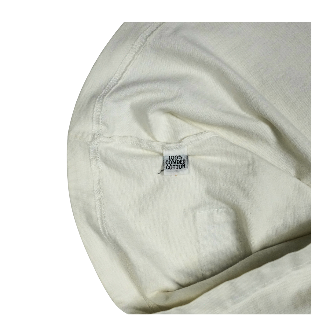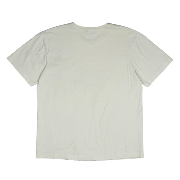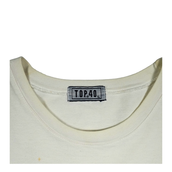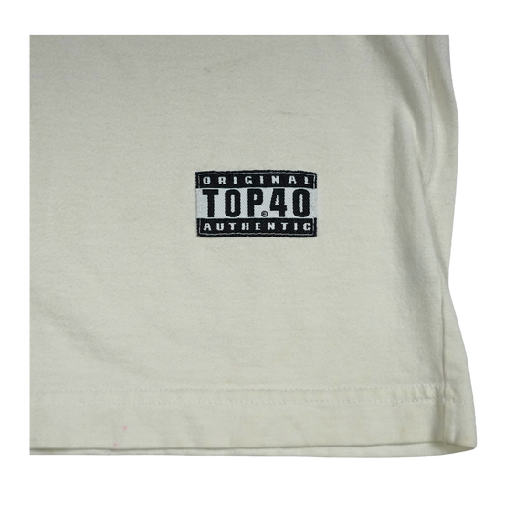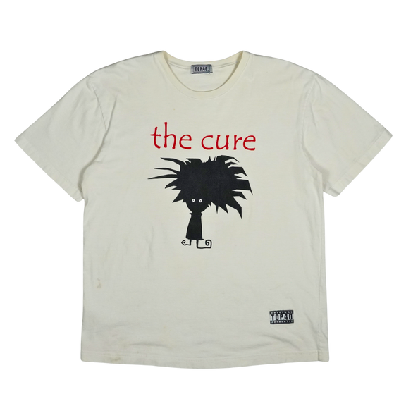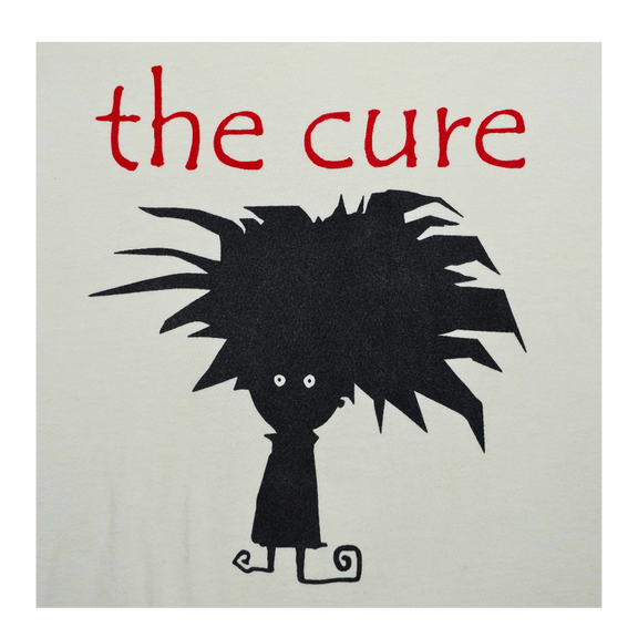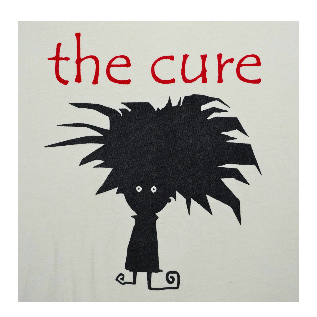 Vintage 2000s The Cure band tee featuring a minimalist cartoon graphic inspired by Robert Smith’s iconic hair silhouette. Printed in bold black with “the cure” in red text above, this shirt captures the band’s post-punk and gothic new wave aesthetic. Made on a Top 40 tag, 100% combed cotton, with original hem tag branding. A collectible piece for fans of The Cure’s era-defining music and imagery.