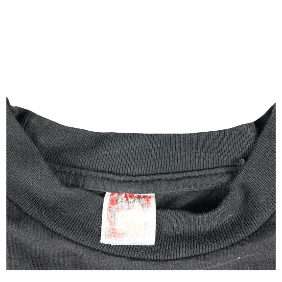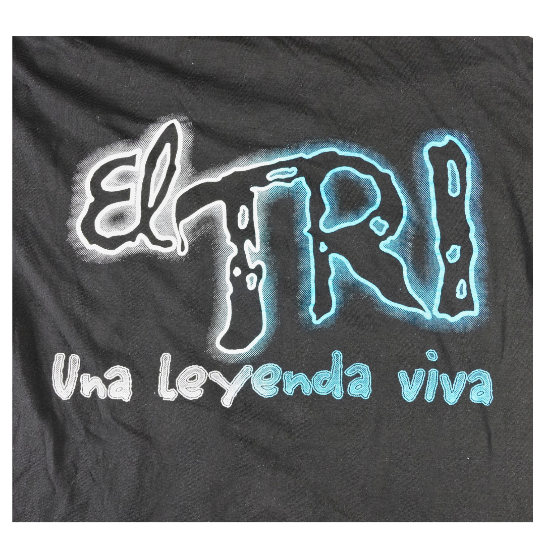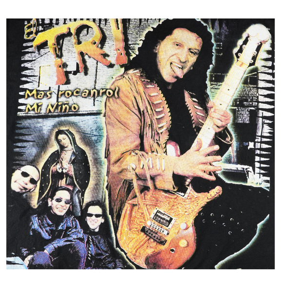 This vintage El Tri tee celebrates the iconic Mexican rock band’s 35th anniversary with a loud and proud graphic of front man Alex Lora and the words “Más Rocanrol Mi Niño.” Featuring a striking full-color front print with the band, La Virgen de Guadalupe, and a flame-textured guitar, this shirt captures the gritty essence of Mexican rock culture. The back reads “El Tri Una Leyenda Viva” — a nod to the band’s legendary status. Printed on a soft, worn black tee with a faded tag and heavy wash, this piece is likely from the early 2000s, commemorating their 2003 tour. A must-have for collectors of Latin rock history or fans of El Tri’s rebellious energy.