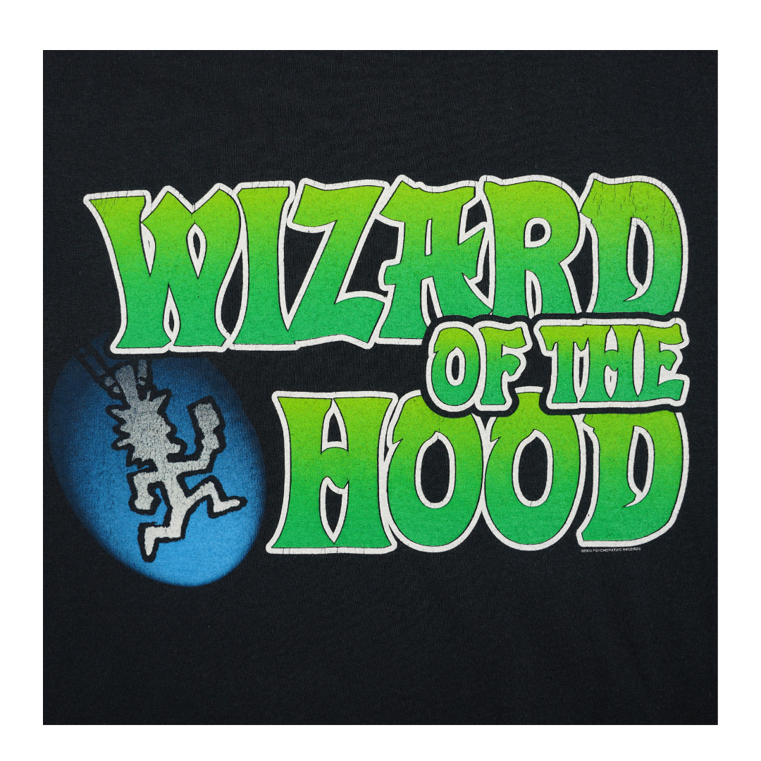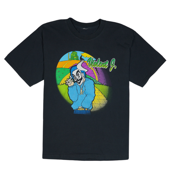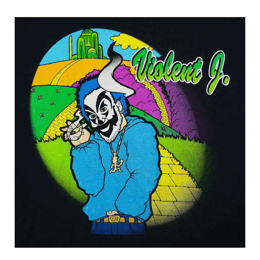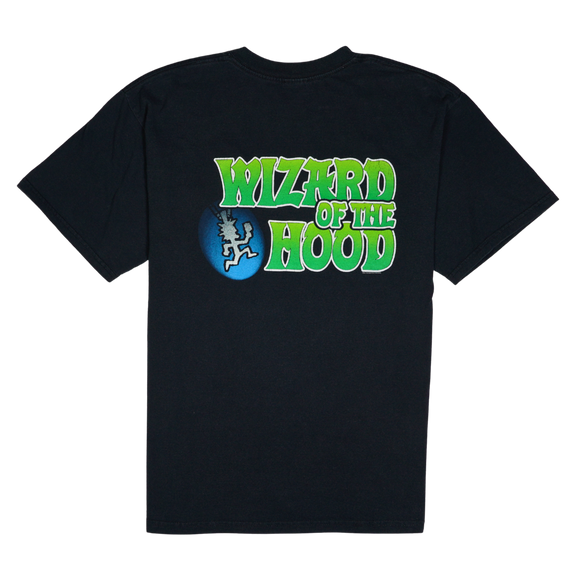 This vintage 2003 Violent J Wizard of the Hood tour tee captures a unique crossover moment in hip-hop and horrorcore history. Featuring Violent J of Insane Clown Posse reimagined in a Wizard of Oz-inspired scene, the shirt reflects the release of his solo concept album Wizard of the Hood, a fan-favorite project blending theatrical storytelling with ICP’s underground legacy. The front graphic shows Violent J smoking and standing against a psychedelic Emerald City backdrop, while the back boasts bold Wizard of the Hood lettering with the Hatchetman logo. Printed during the early 2000s Psychopathic Records era, this shirt embodies the creativity and cult following of the juggalo world. A true piece of vintage ICP culture, it’s an essential pickup for collectors of hardcore rap merch and early 2000s underground memorabilia.