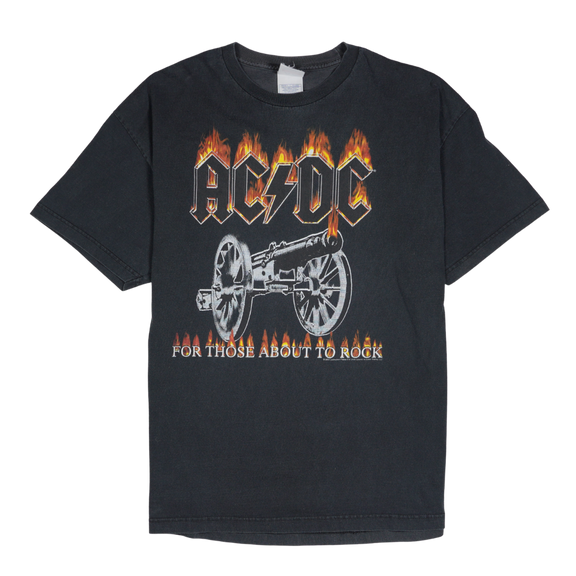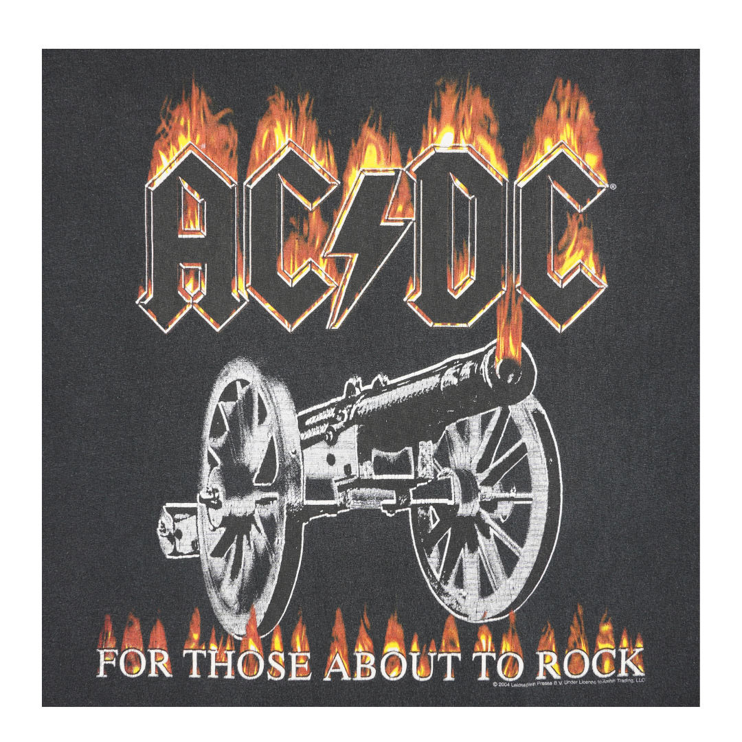 Description: This vintage 2004 AC/DC tee pays tribute to the band’s iconic 1981 anthem For Those About to Rock (We Salute You), a track that has defined their live shows for decades. The front graphic erupts with the band’s jagged lightning logo engulfed in flames, perched above a heavy iron cannon locked and loaded — imagery forever tied to their explosive live tradition of firing real cannons on stage during the chorus.