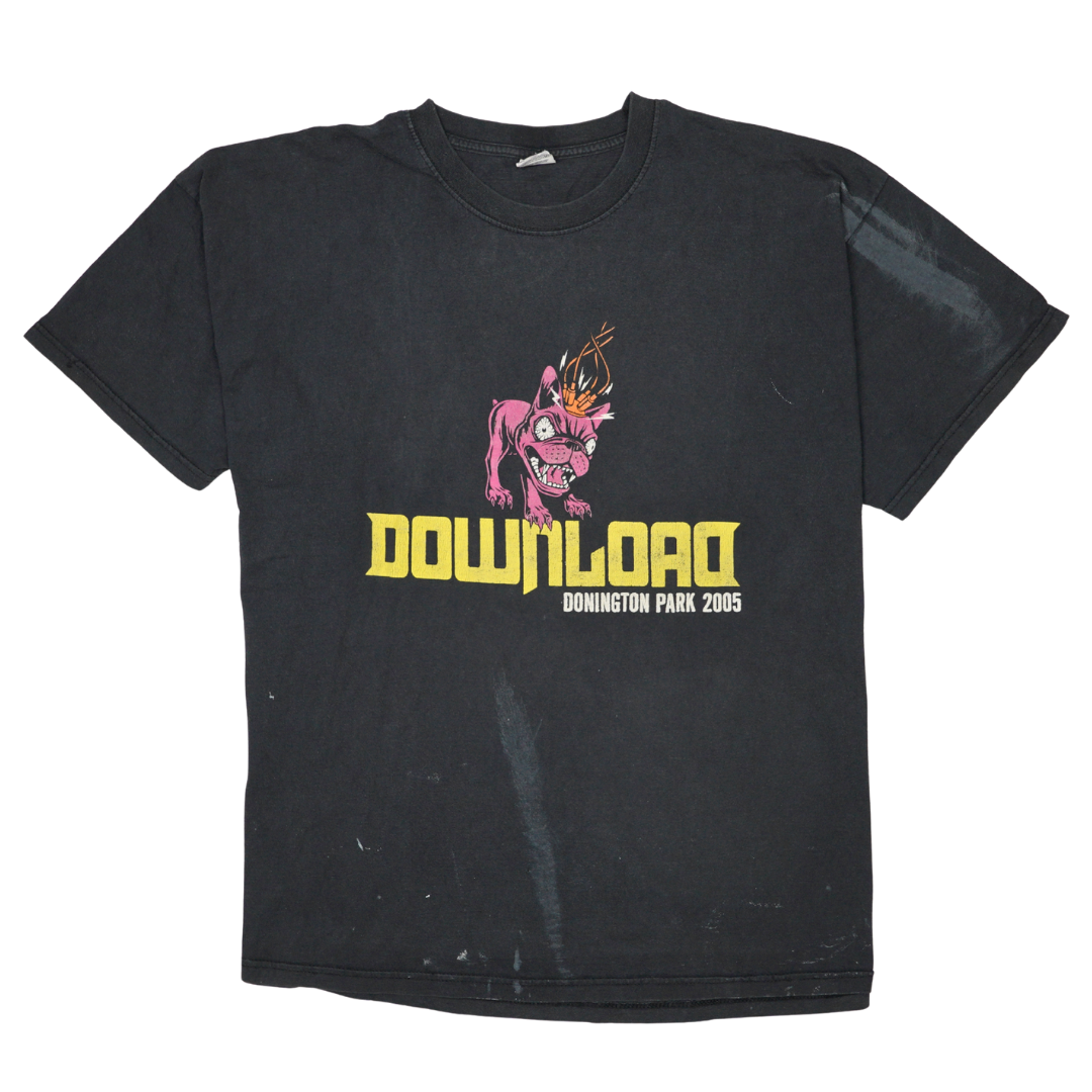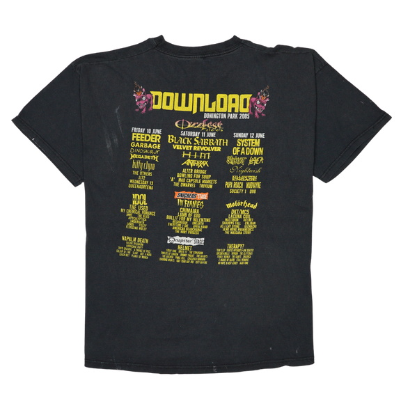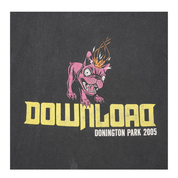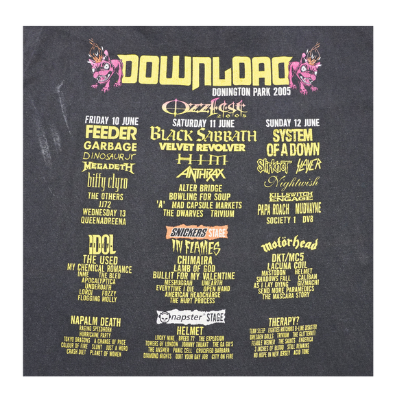 This vintage tee roars straight out of Donington Park, capturing the ferocious energy of the 2005 Download Festival. Featuring the snarling pink bulldog mascot with a flaming crown above bold yellow type, the front graphic screams early-2000s heavy metal bravado. But it’s the back that tells the real story: a full festival lineup with legends like Black Sabbath, System of a Down, Slayer, Anthrax, HIM, Velvet Revolver, and Motorhead—names that defined a generation of distortion and rebellion.