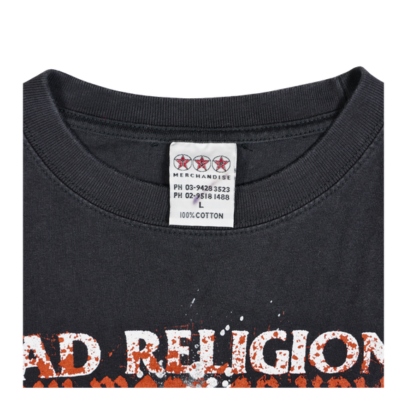 The tag traces its roots to the 2007 Australia/Euro merch runs, with the three-star “MERCHANDISE” branding and a perfectly broken-in cotton blank. There’s no back hit — because the message doesn’t need repeating. Just a stark black tee with the kind of cracked ink and unapologetic commentary that defines vintage punk gear. For Bad Religion diehards and streetwear collectors alike, this is a holy grail with fire in its seams.